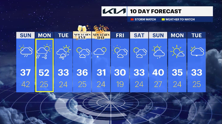 THURSDAY: NEW YEAR'S DAY — Partly sunny to mostly cloudy. Highs around 31. Lows near 21.