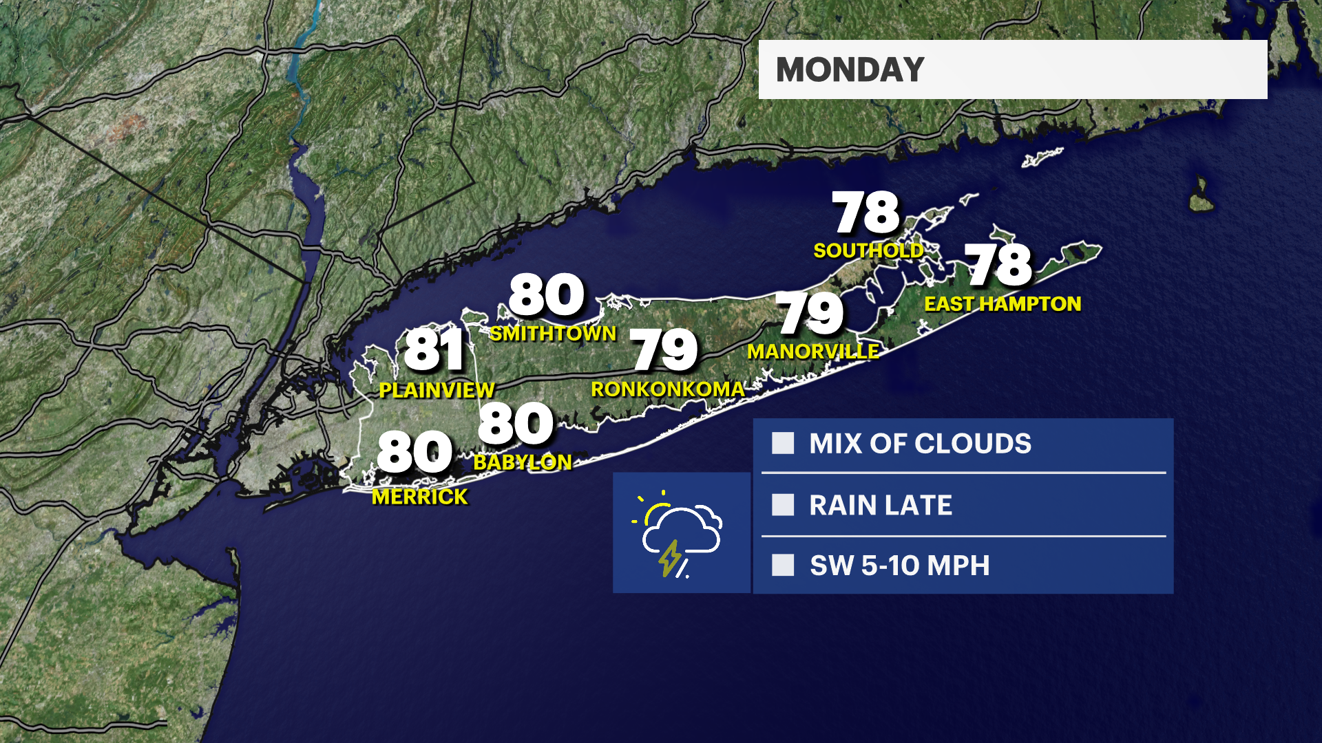Shower early Monday, then peeks of sun with a stray storm. Best chance for