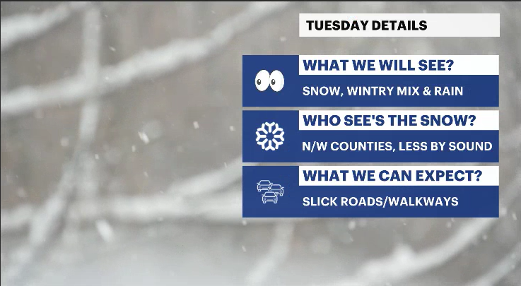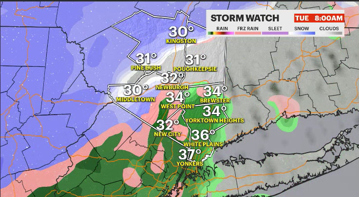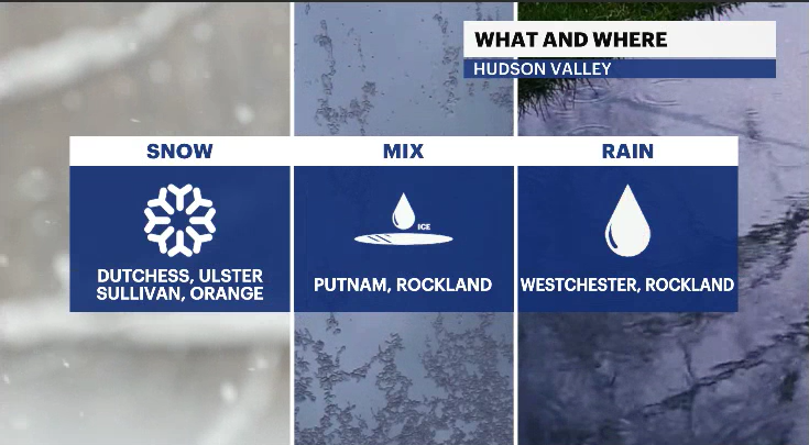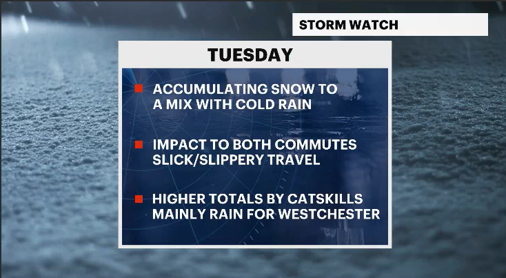 TUESDAY: Snow, wintry mix, and cold rain. Be prepared for treacherous roads and travel throughout the day. Westchester County is expected to mainly see rain throughout the day, which could accumulate up to an inch of rainfall by the end of the event. Any snow and rain will end by early Tuesday night. Dry and colder air will move in. Highs in the 30s. Lows in the 20s.