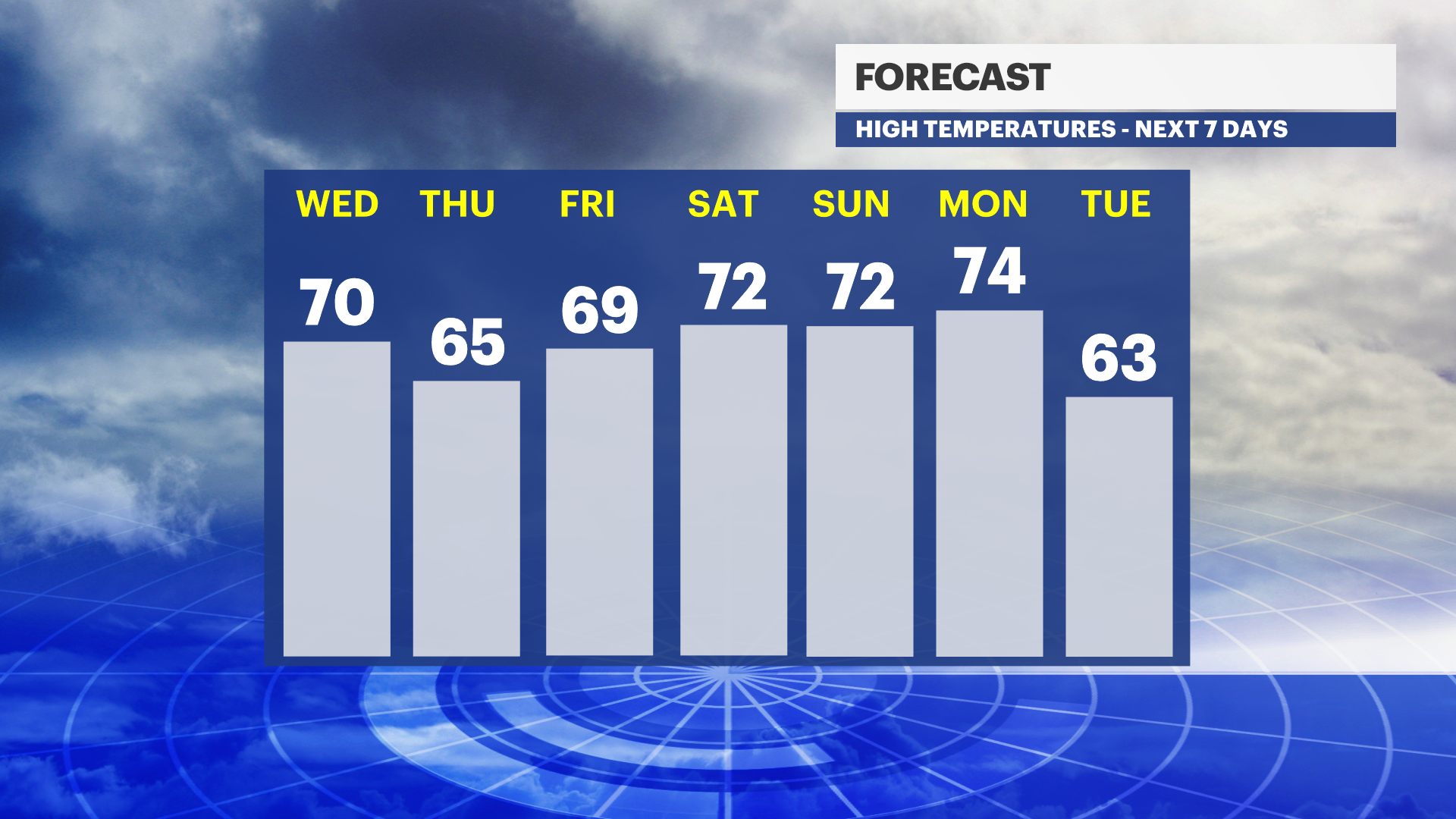 WEDNESDAY: Mostly Sunny. Highs near 70.