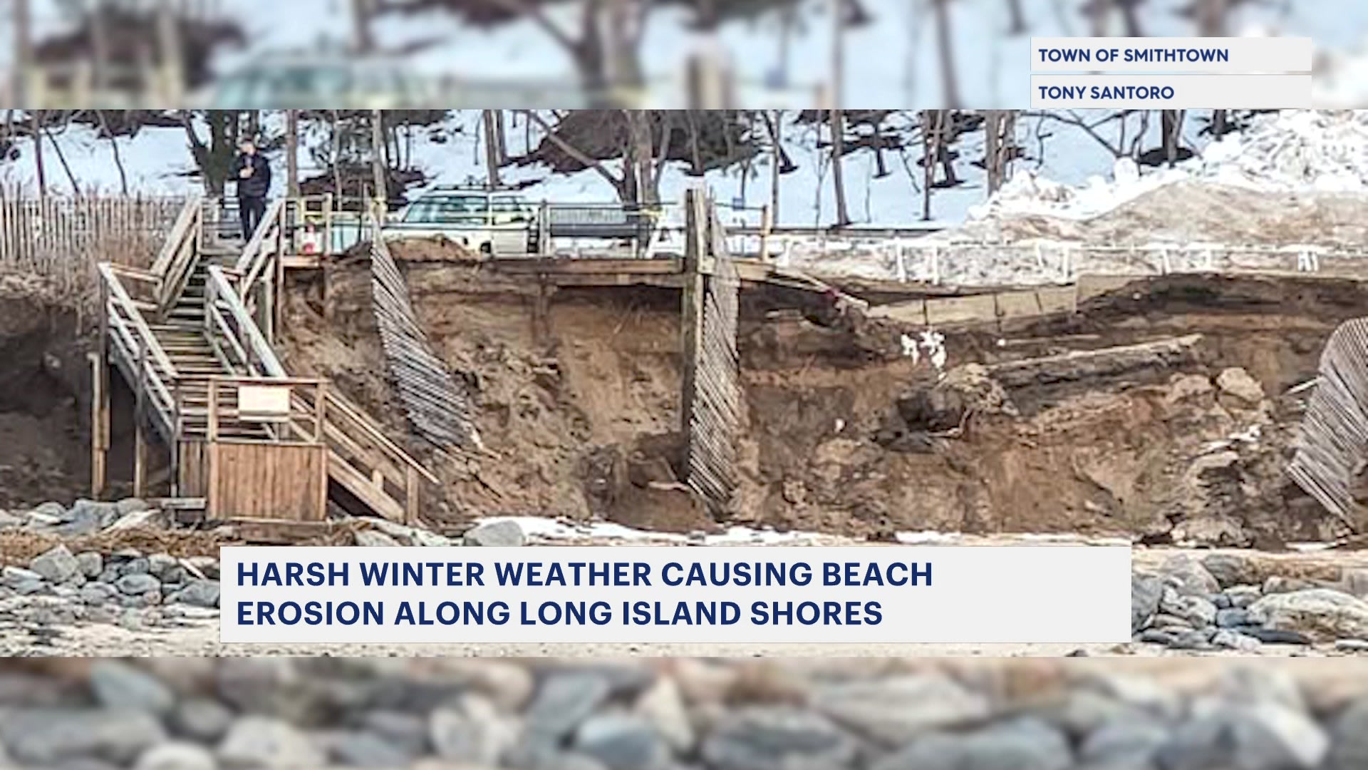 In the Town of Smithtown, winter weather damaged the stairs to the beach and stripped dirt and sand at the Kings Park Bluff in Kings Park along the Nissequogue River and the Long Island Sound.