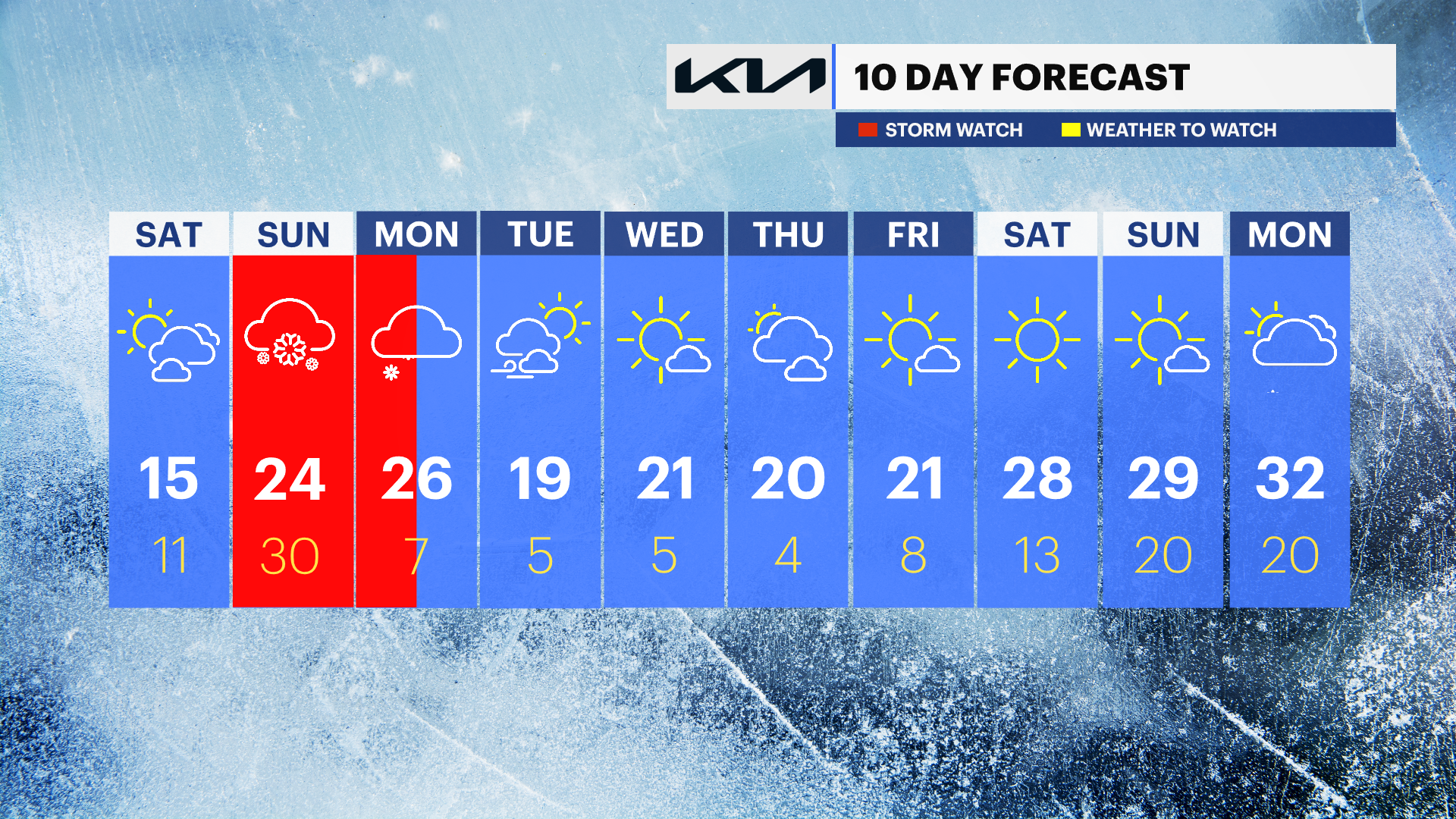 SUNDAY: STORM WATCH - Light snow at first with moderate to heavy snowfall arriving later in the day. There is a chance for some mixed precipitation closer to the city. Highs in the upper teens. Lows in the mid-teens.