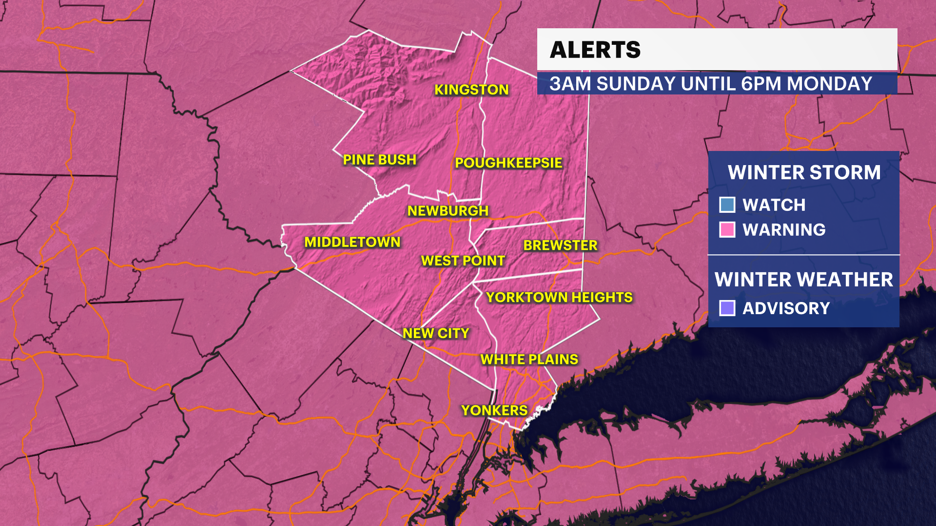 A winter storm warning has been issued for the entire region from late Saturday night through Monday, with the most intense conditions expected throughout Sunday. During this peak period, snowfall rates could reach up to 2 inches per hour, significantly reducing visibility to near-whiteout levels and creating hazardous conditions for anyone on the roads.