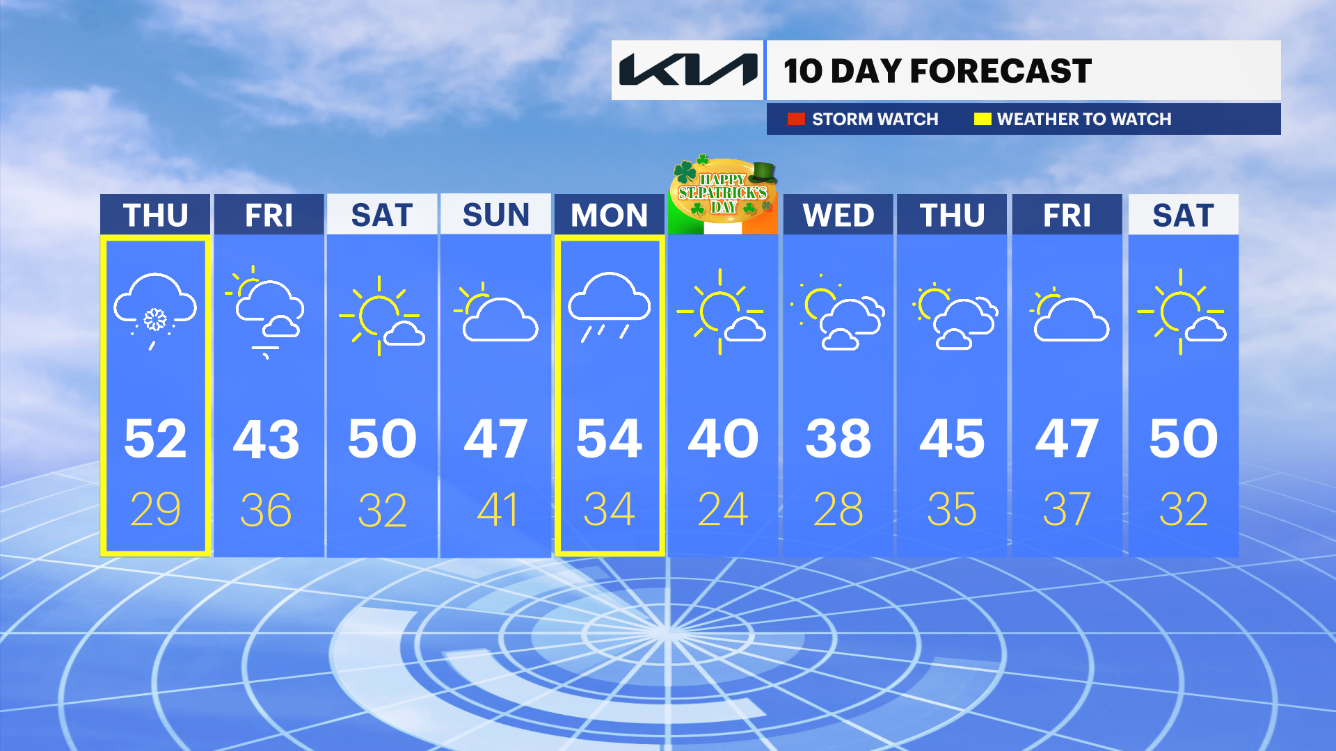 By Friday, the system pulls away, bringing partly sunny skies, breezy conditions, and a colder feel with afternoon highs mainly in the 40s.