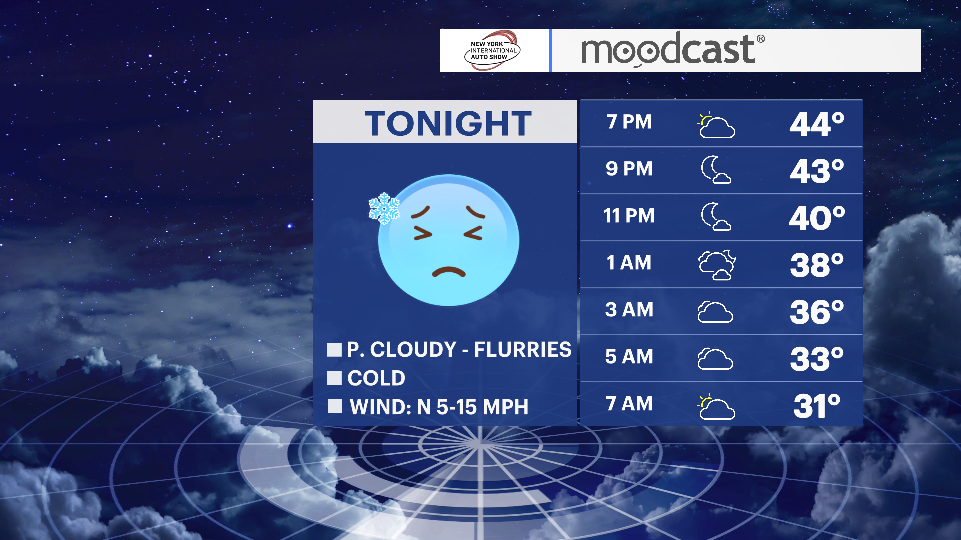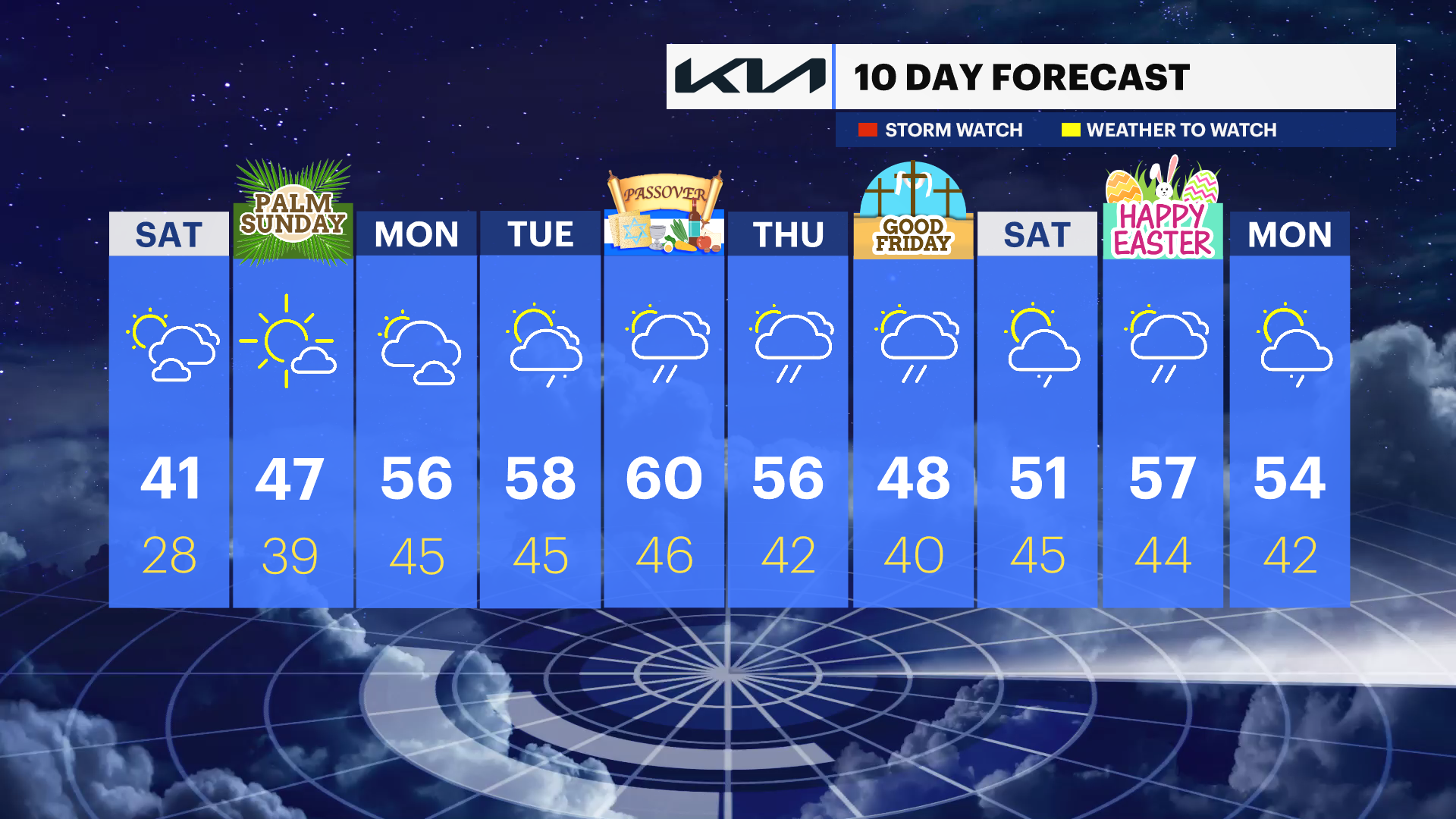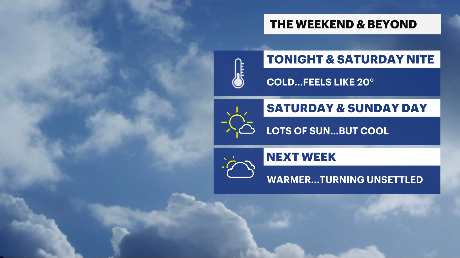Cold air rushes in Friday night, setting the stage for a much colder start to the weekend. There’s a small chance of a brief mix of light rain or even a few wet snowflakes, but nothing significant is expected. Saturday will feel more like winter than spring—breezy and chilly, with temperatures only reaching the low to mid-40s and wind chills in the 20s early in the day.