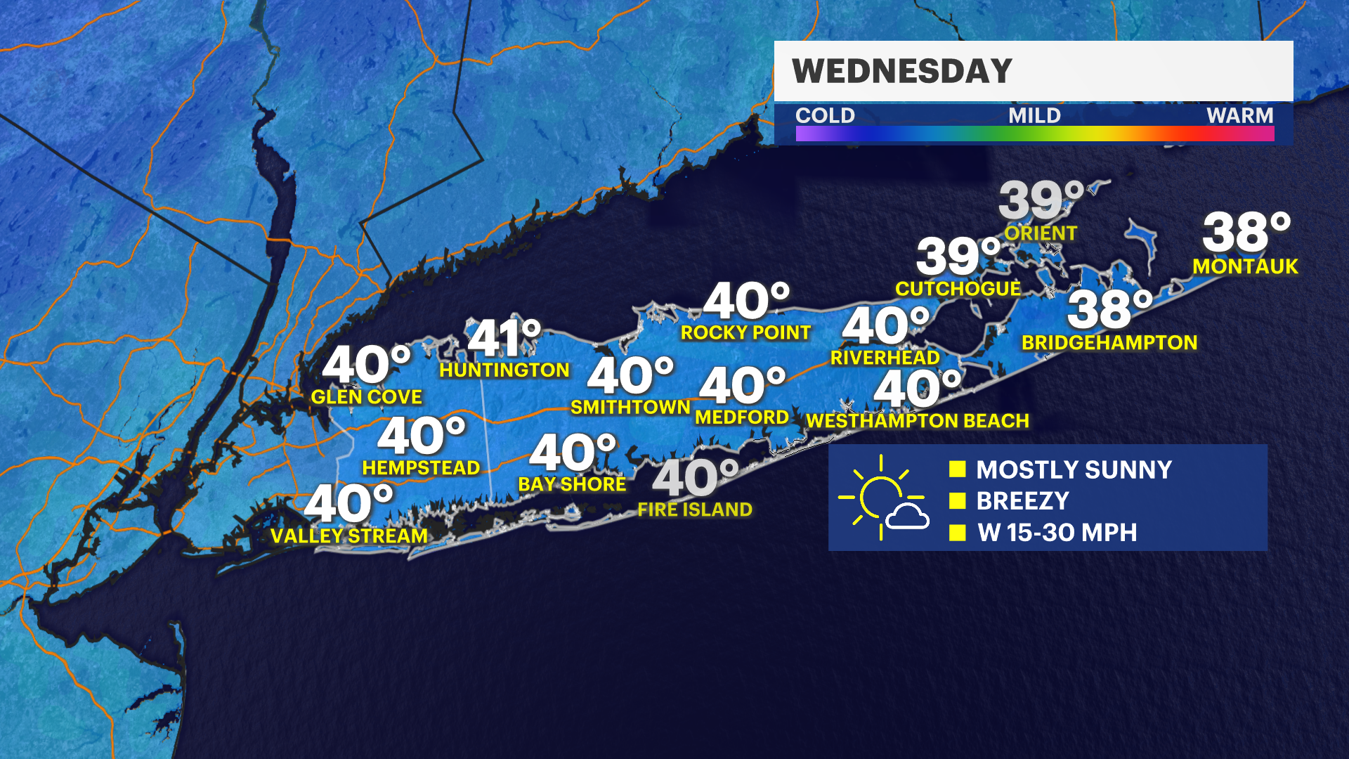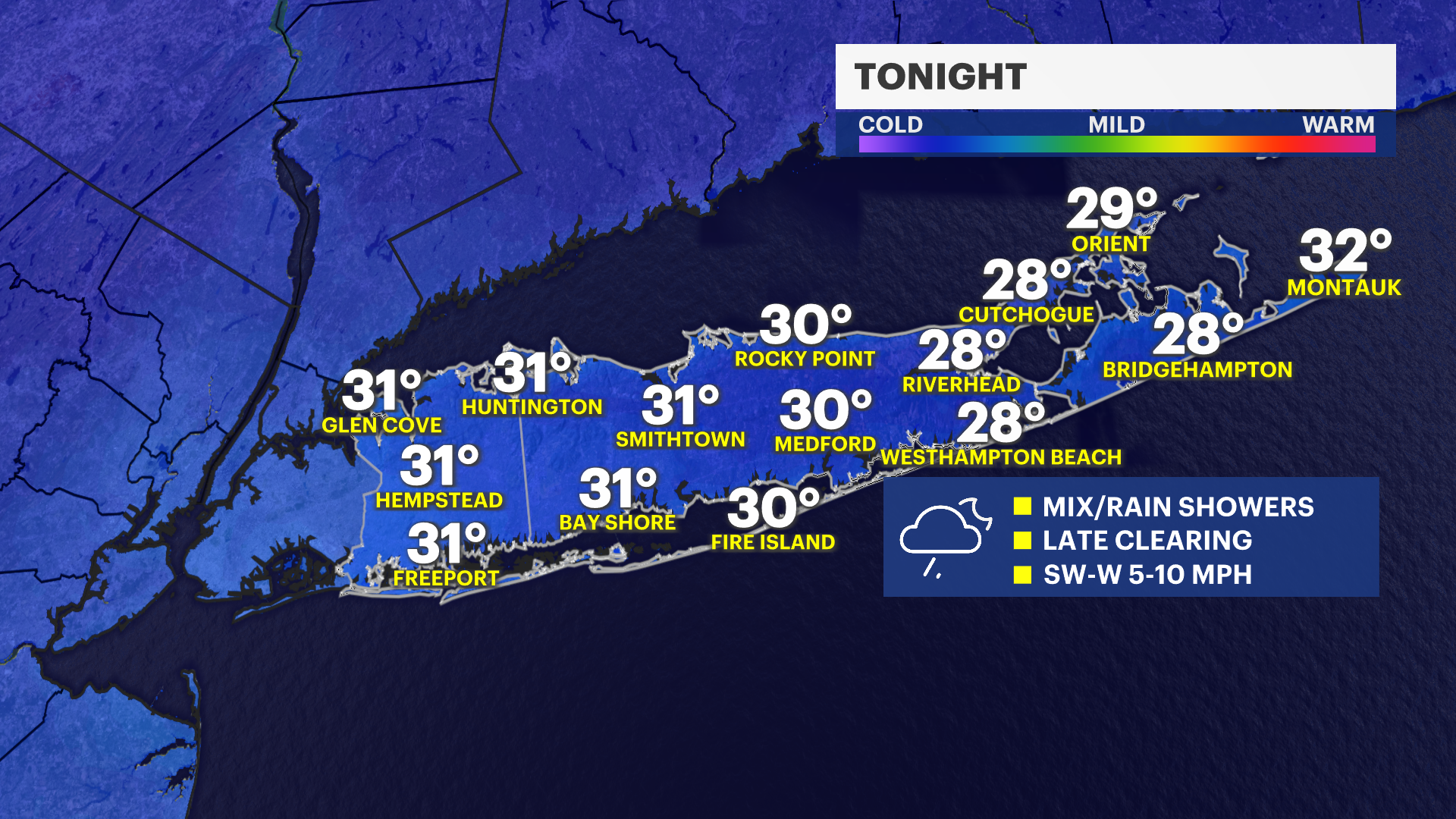 ALERTS: A winter weather advisory is in effect from 6 p.m. until 6 a.m. Wednesday for the North Shore of Nassau, Suffolk counties. Temperatures can be close to freezing along parts of northern Long Island tonight as rain develops. This can lead to a trace of ice and slippery spots into Wednesday morning. The rest of Long Island is expected to get plain rain.