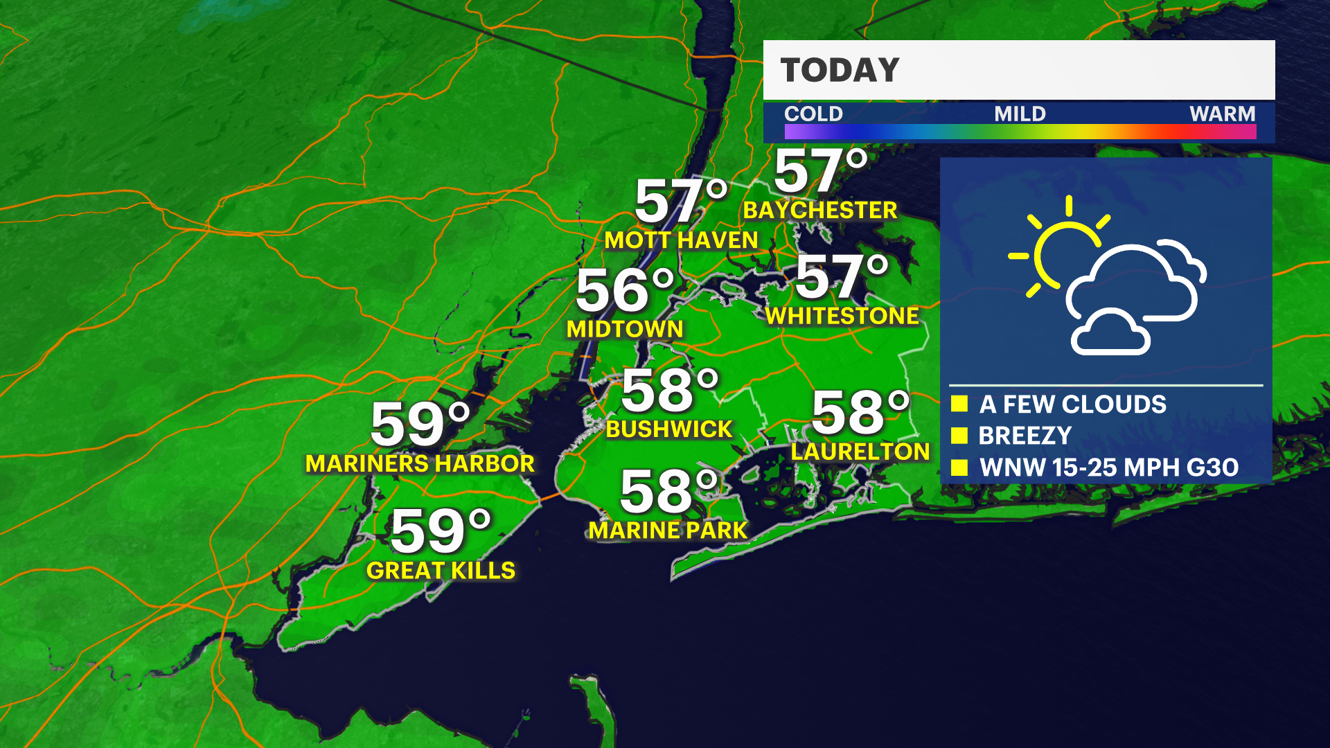 Today will be sunny and seasonable, with lighter winds, though it will still feel breezy with gusts to 30 mph, and highs in the upper 50s.