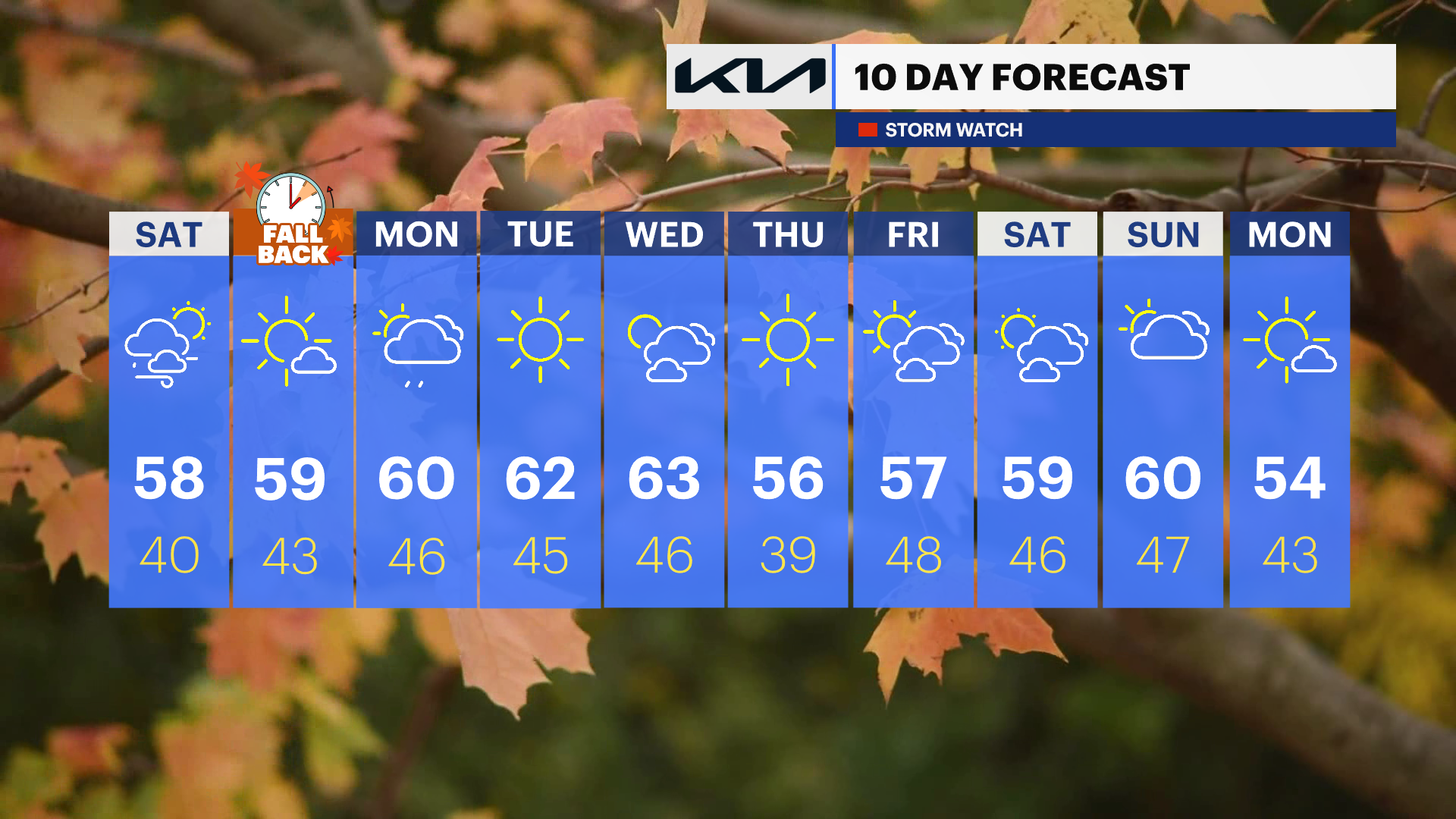 Saturday night will be partly cloudy and cool with lows in the low 40s. Sunday brings another pleasant day with mostly sunny skies, light breezes, and highs near 57. Clouds increase Sunday night as our next system approaches.