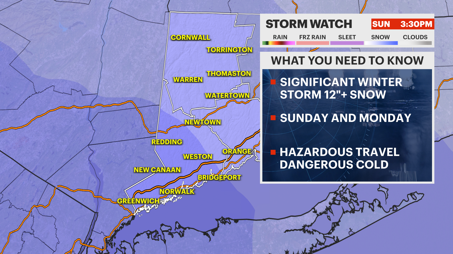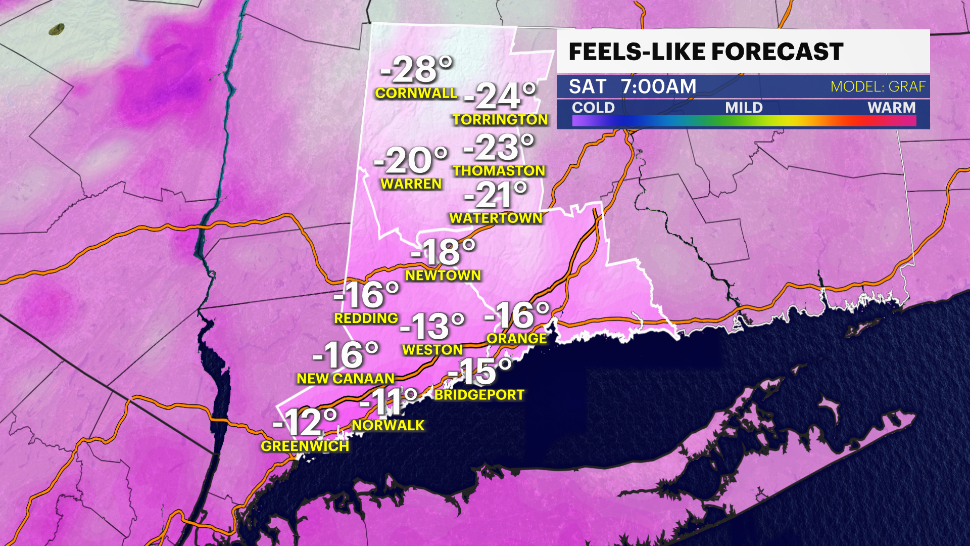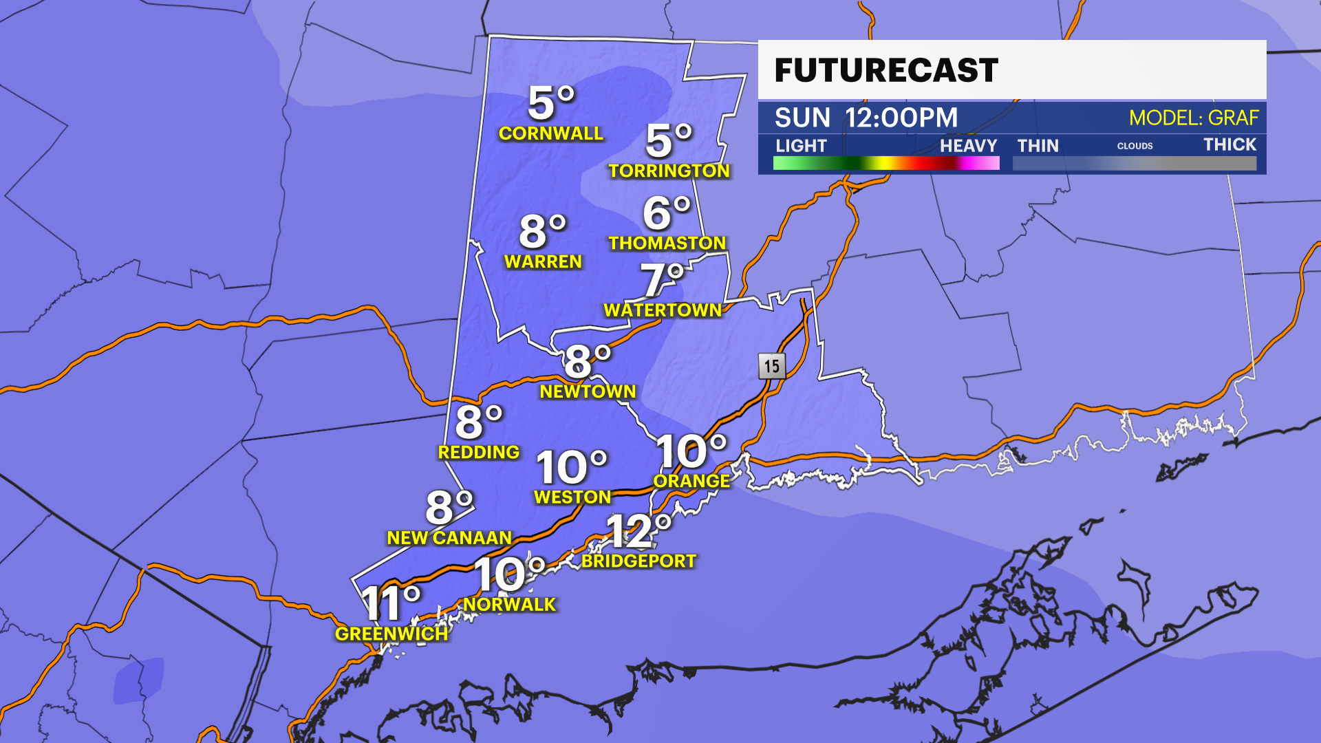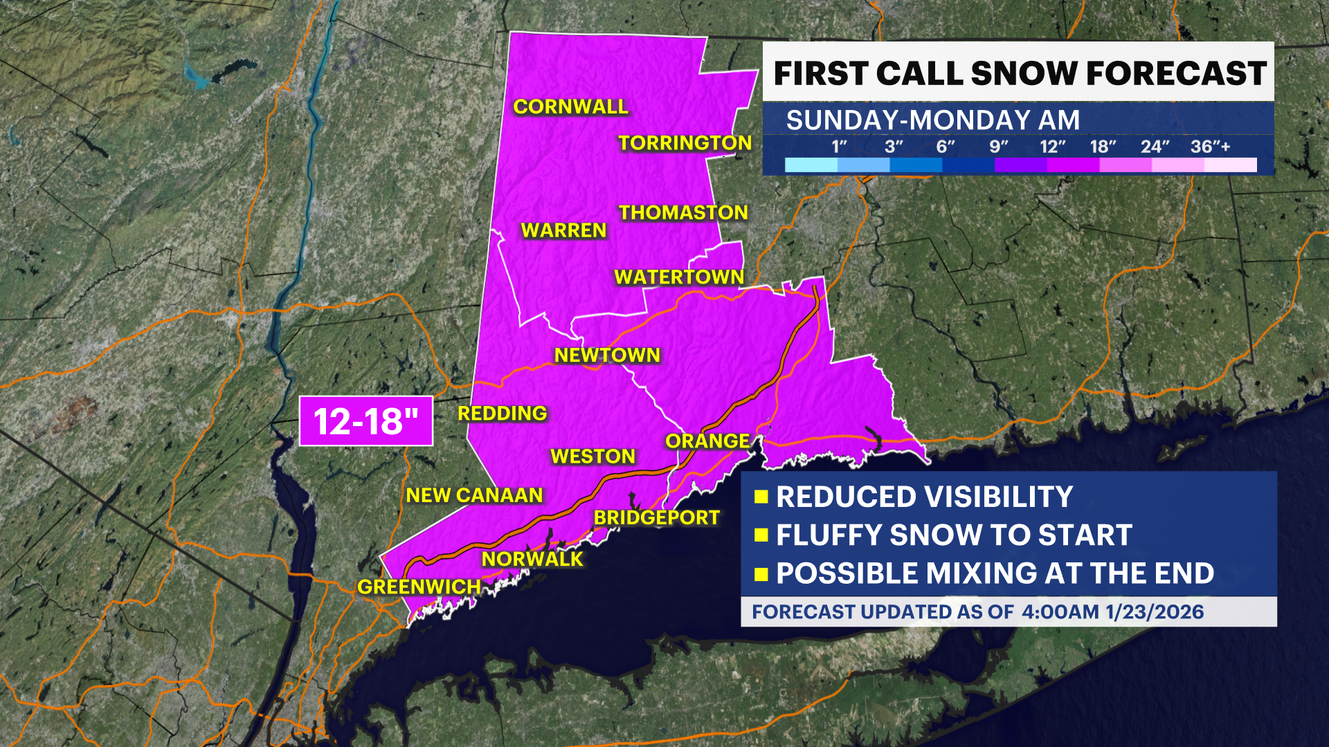 With the News 12 Storm Watch Team's snow map, western Connecticut could see about 12 inches of snowfall and potentially up to about 18 inches up north. Temperatures will remain cold during the duration of the storm, but southern Fairfield County will need to be watched for any mixing.