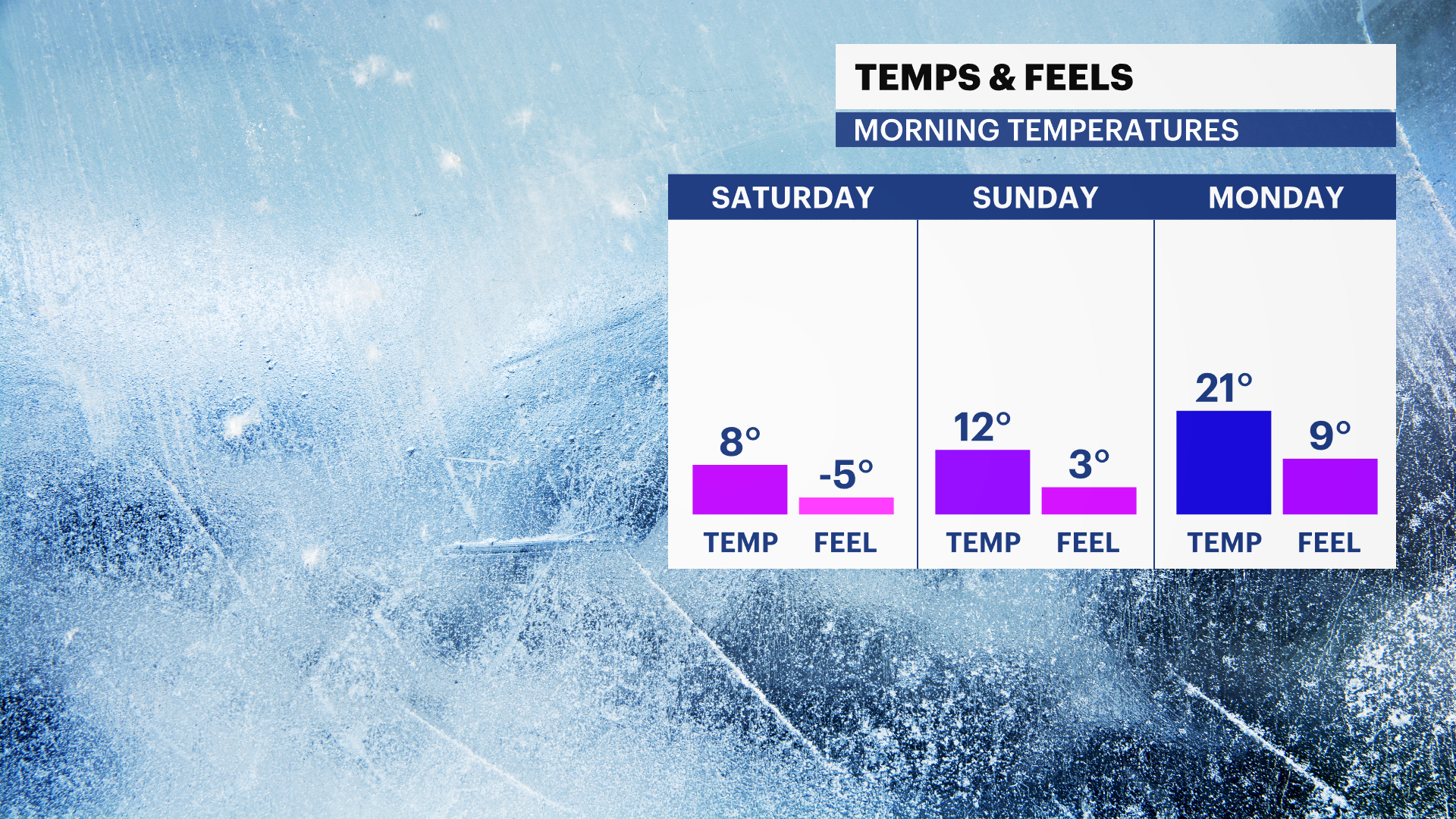 When the snow arrives on Sunday, temperatures will be around 10 degrees, rising into the lower 20s during the day and then the upper 20s at night.