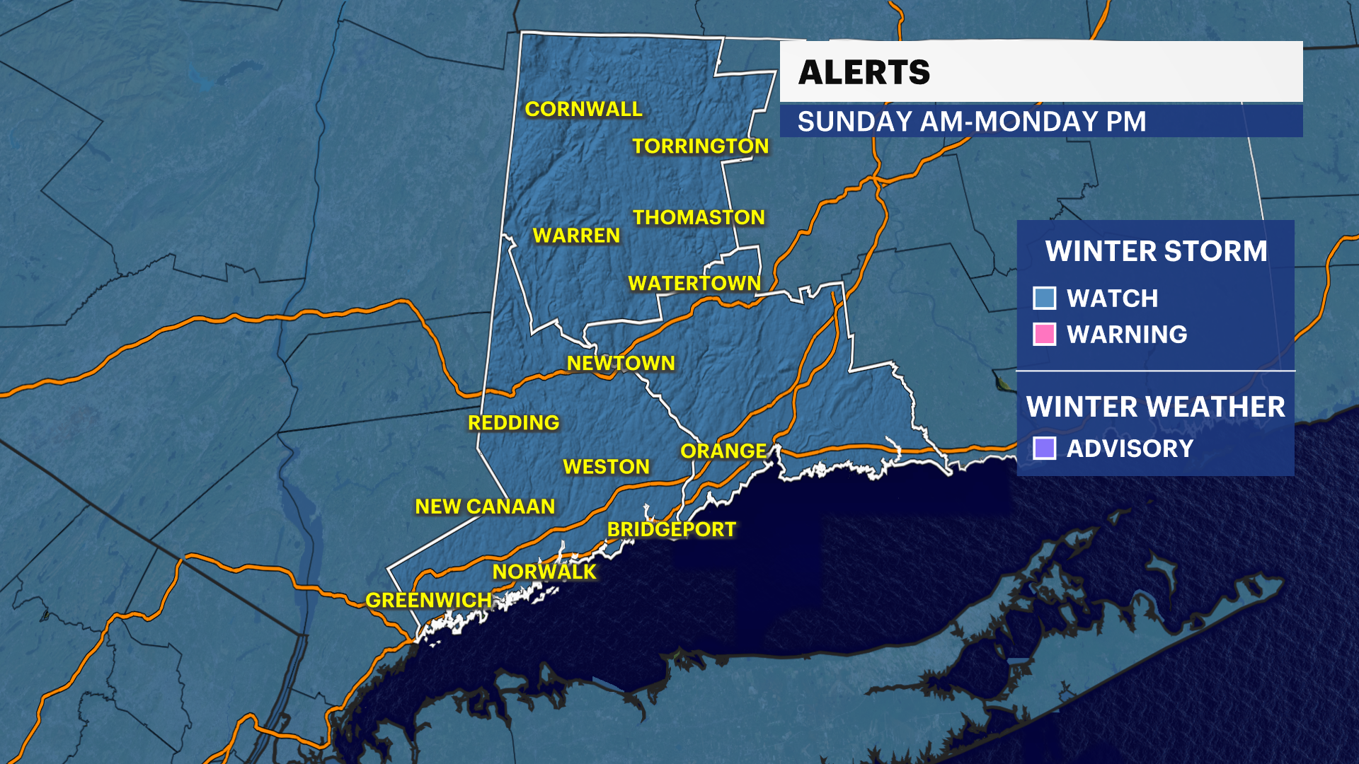 A Winter Storm Watch starting early Sunday morning through Monday evening. Heavy snow and possibly mixing with sleet for a time closer to the shoreline.