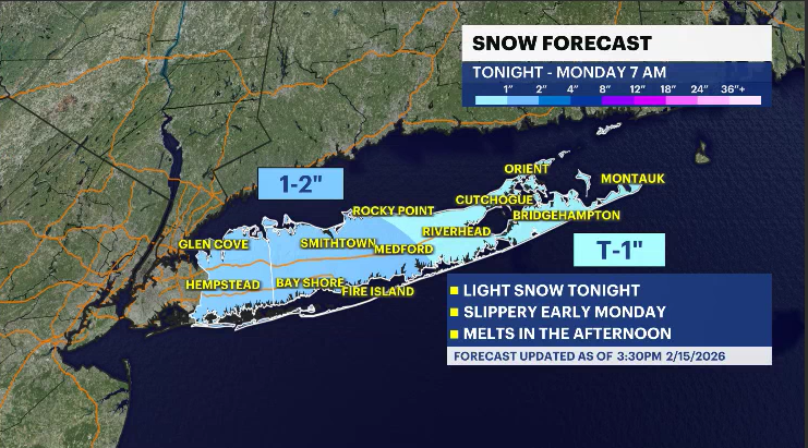 A round of light snow showers will move through starting around 9 p.m. and continuing overnight. Impacts are expected to be minor, with snow ending around 6 a.m. Monday. A general one inch of snow is expected, but isolated reports of two inches are possible, while areas out east could see generally a trace to one inch of snow.