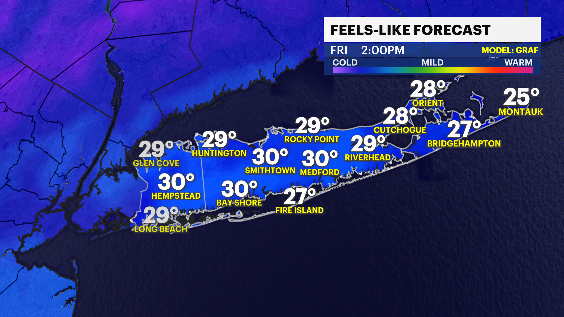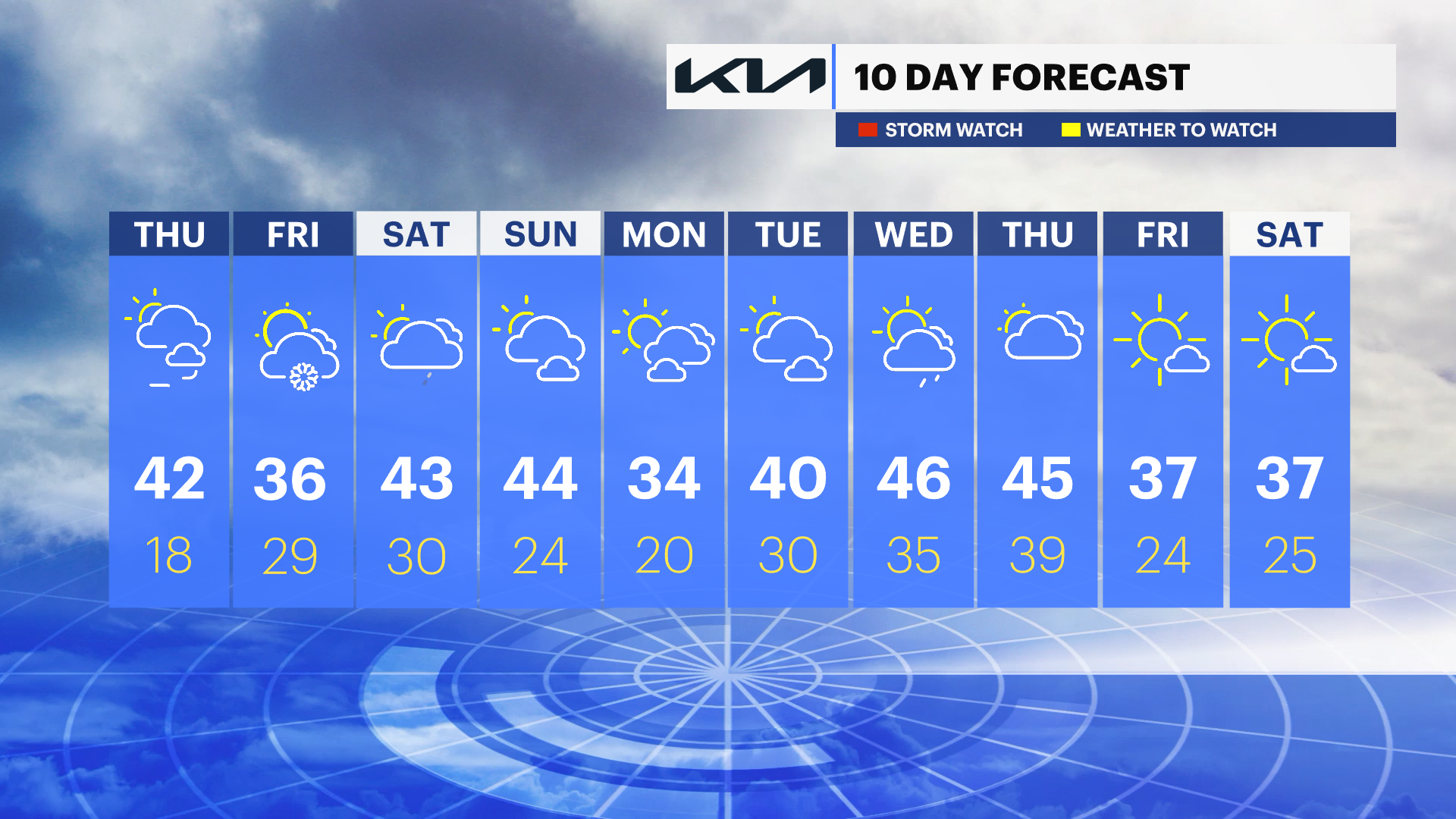 Saturday Night: Partly cloudy with a low around 30. Northwest wind 5 to 10 mph. Sunday: Mostly Cloudy with a high near 43. North wind 5 to 10 mph becoming south in the afternoon. Sunday Night: A chance of snow showers before 1 a.m. Mostly cloudy with a low around 25. Monday: COLD. Mostly sunny with a high near 36. Breezy. Monday Night: COLD. Mostly clear with a low around 18. Tuesday: Partly sunny with a high near 41.