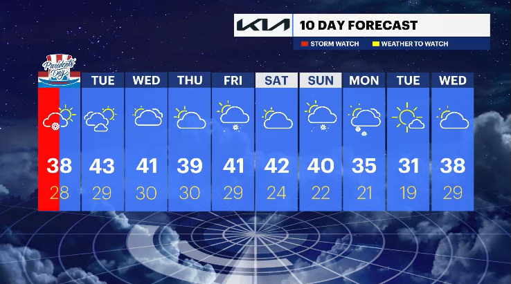 Temperatures are in the 40s for most of the 10-day period, which is the mildest so far this year. However, there are several disturbances to watch, one on Wednesday, which will bring rain, and another on Friday and into next weekend. There's a chance temperatures will turn cold enough next weekend for some winter weather, but at this time the risk is low.