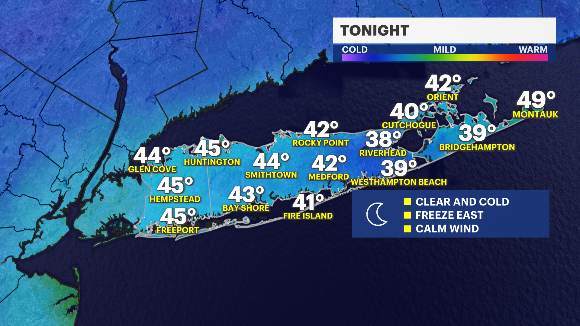 Cold and clear. Freezing temperatures are expected in usual cooler spots out east. Elsewhere, low temperatures will drop to around 40F.
