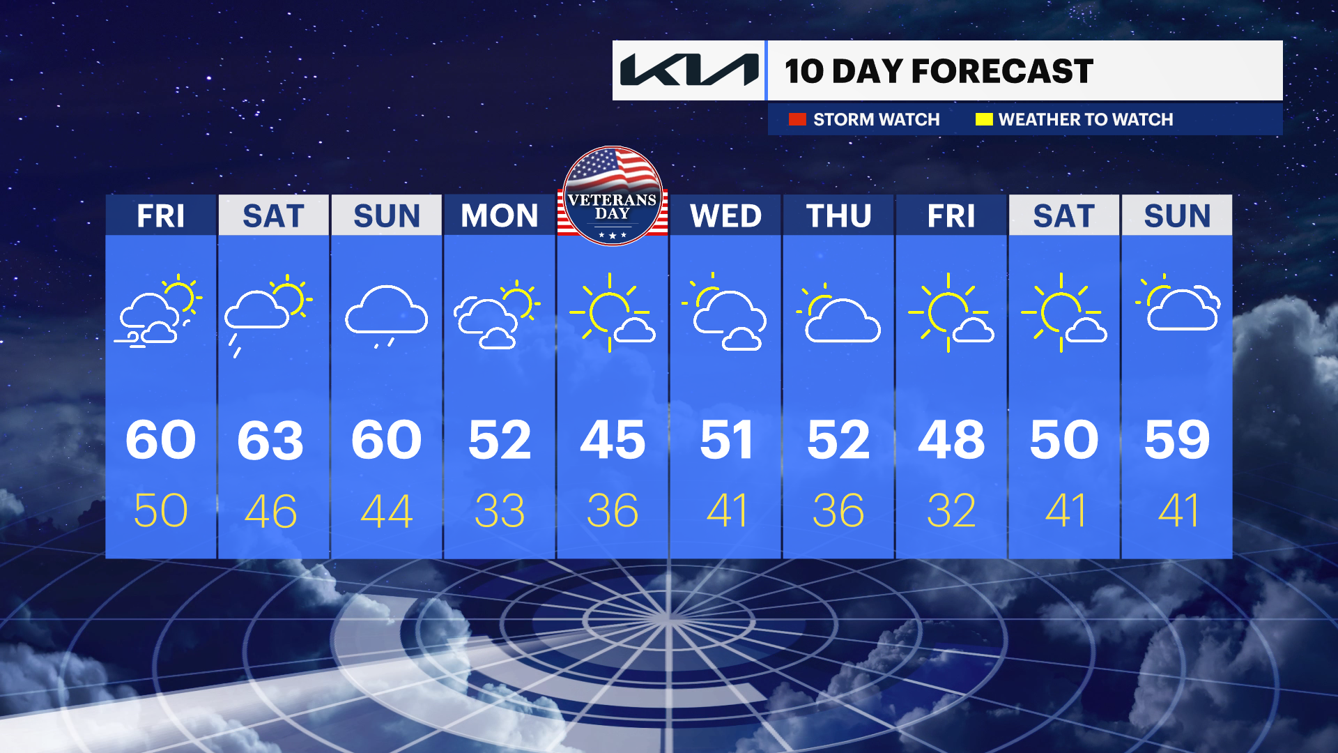 SUNDAY: Mostly cloudy, showers. High of 60.