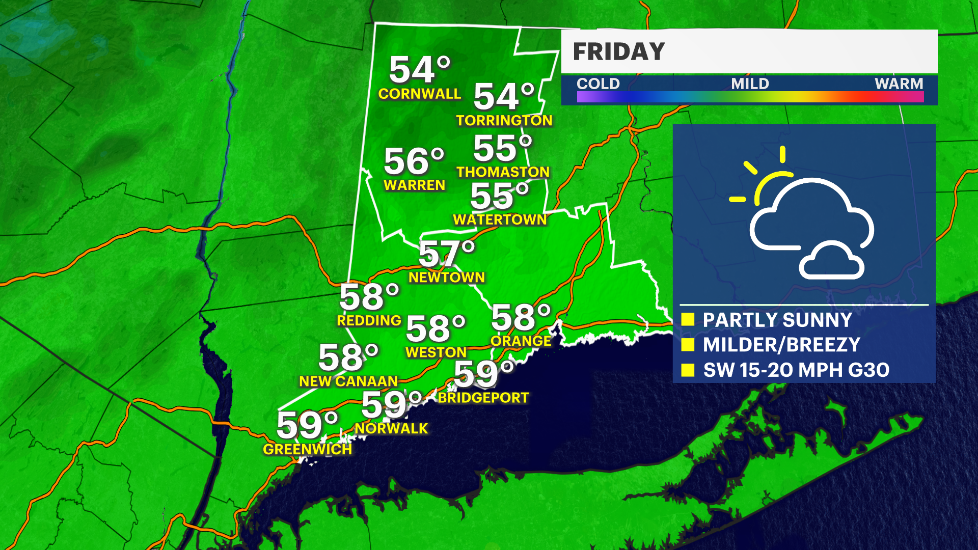 FRIDAY: Partly sunny, breezy, late showers. High of 60.