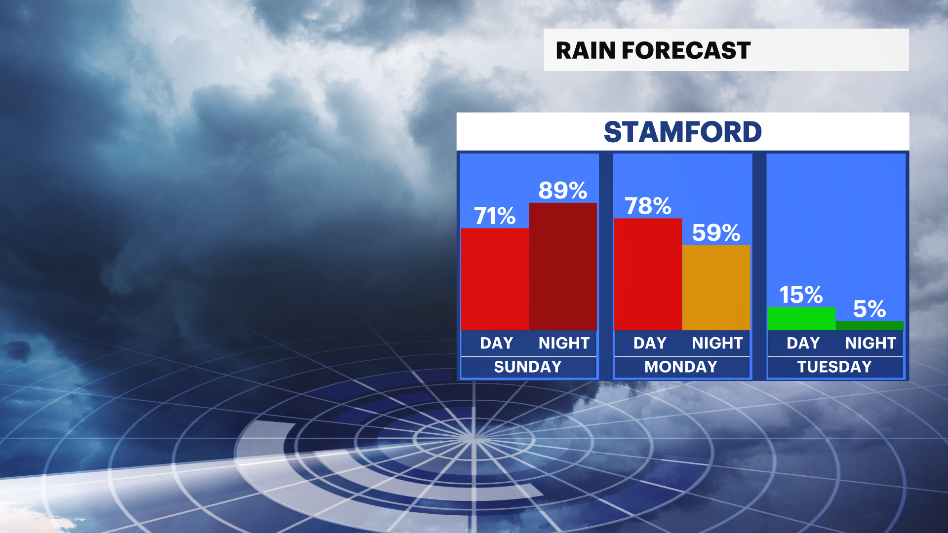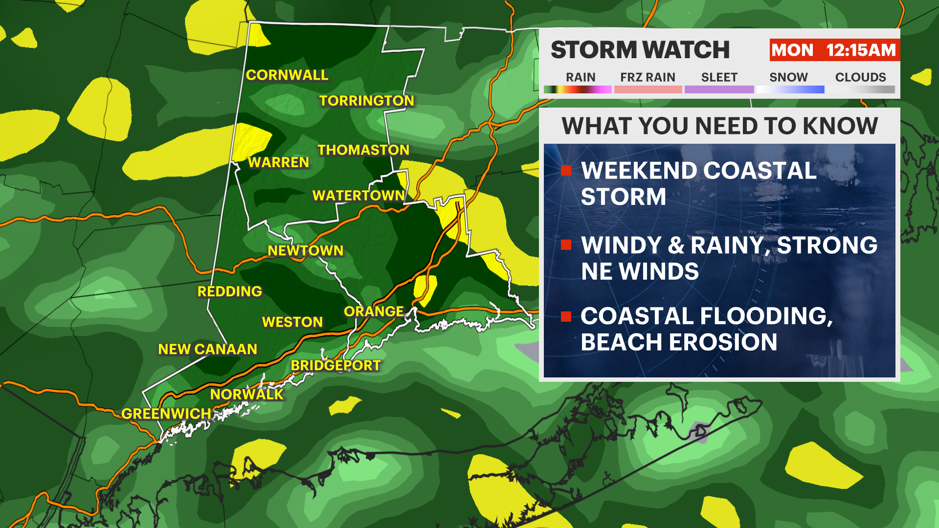 MONDAY: Storm Watch - Cloudy, batches of rain likely, gusty winds at times. Coastal impacts are possible for Westchester County. Highs: upper 50s to low 60s. Lows: upper 40s to low 50s.