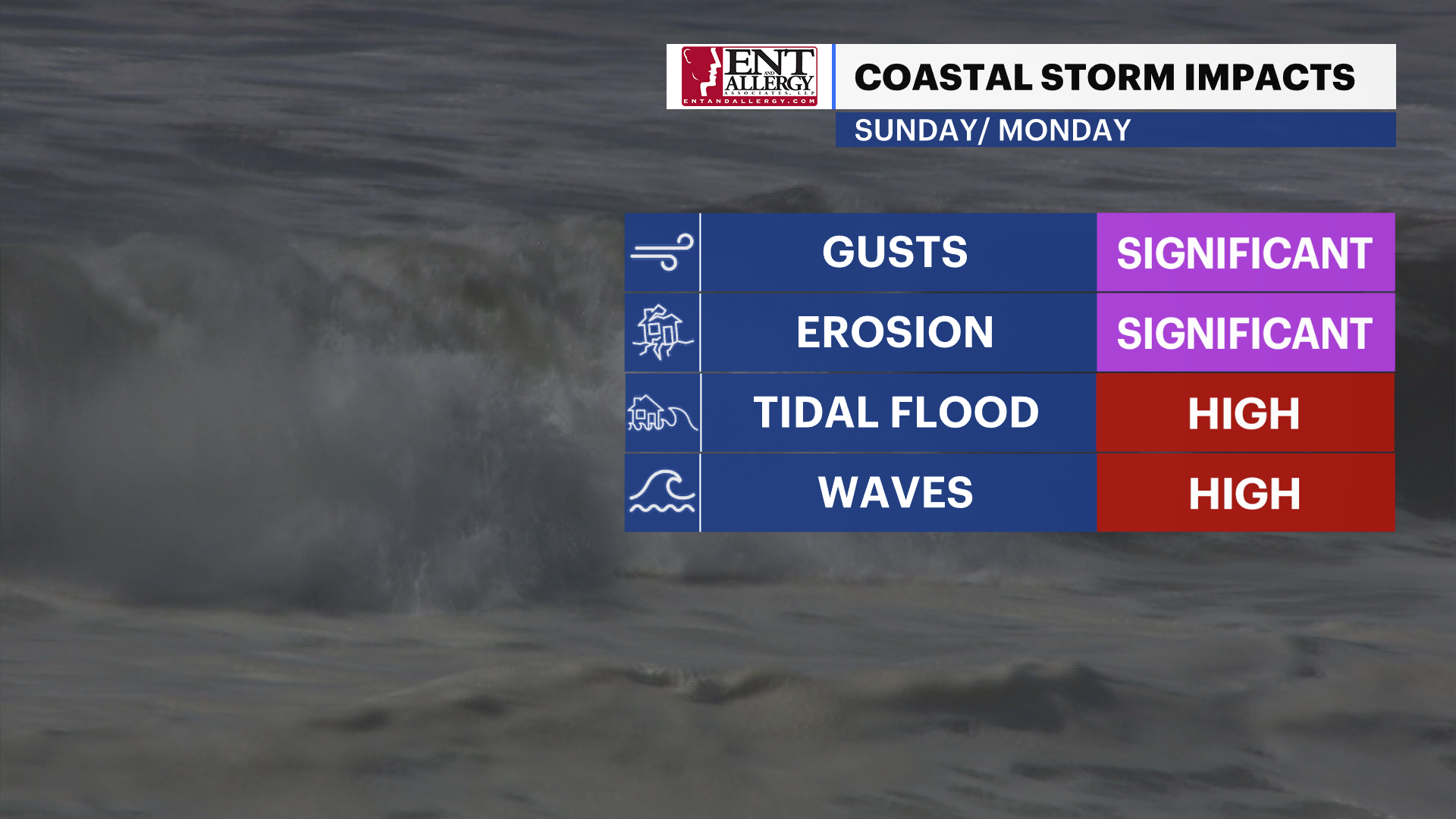 Sunday and Monday potentially can see winds gust up to 35-50 mph along the shoreline. Inland areas will see gusts of 30-35 mph. Due to the persistence and direction, there may be minor damage that can lead to sporadic power outages.