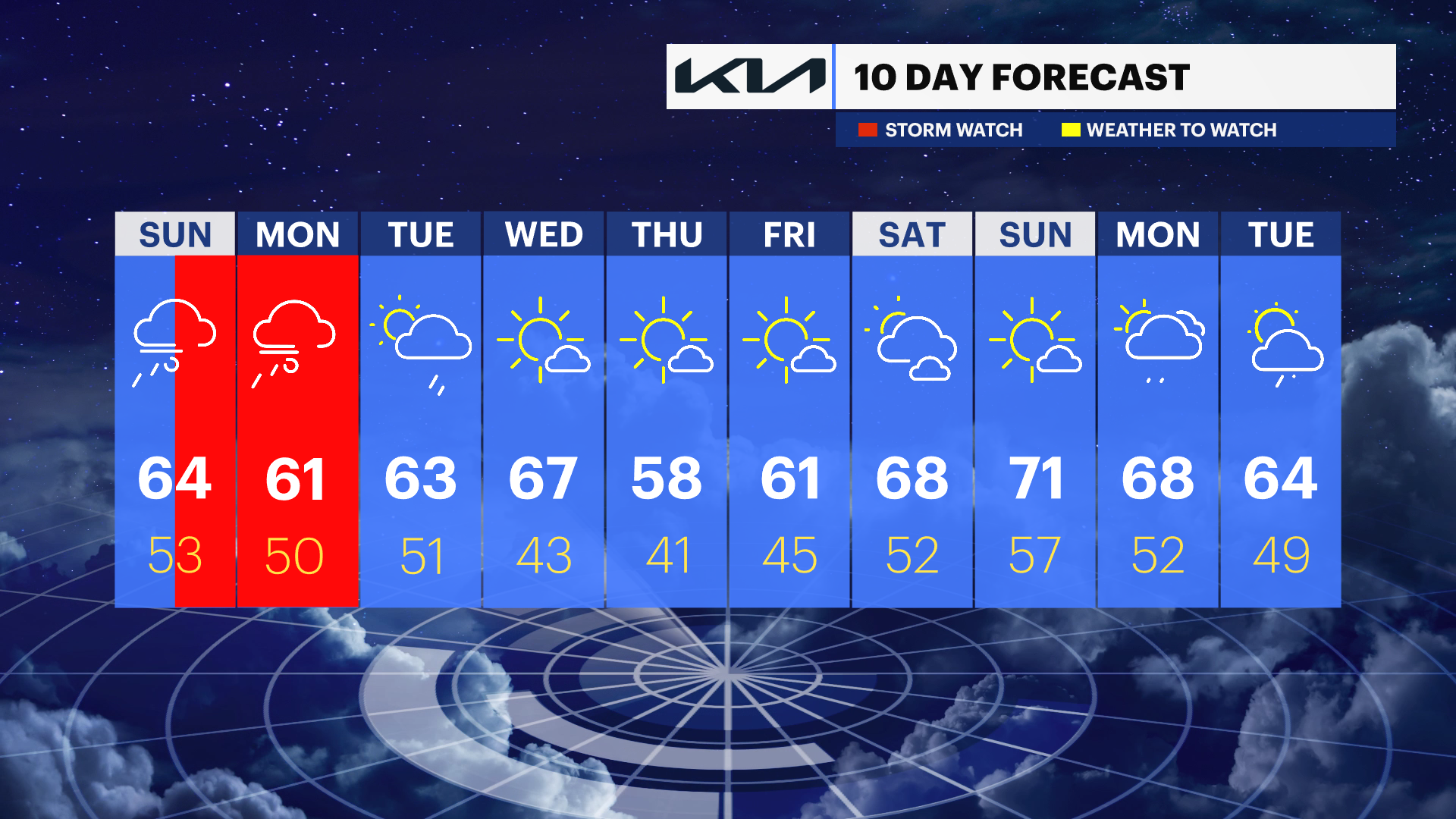 SUNDAY: Storm Watch - Cloudy with rain moving in through the day. A nor'easter will advance northward, increasing the wind potential overnight into Monday. Highs: upper 50s to low 60s. Lows: upper 40s.