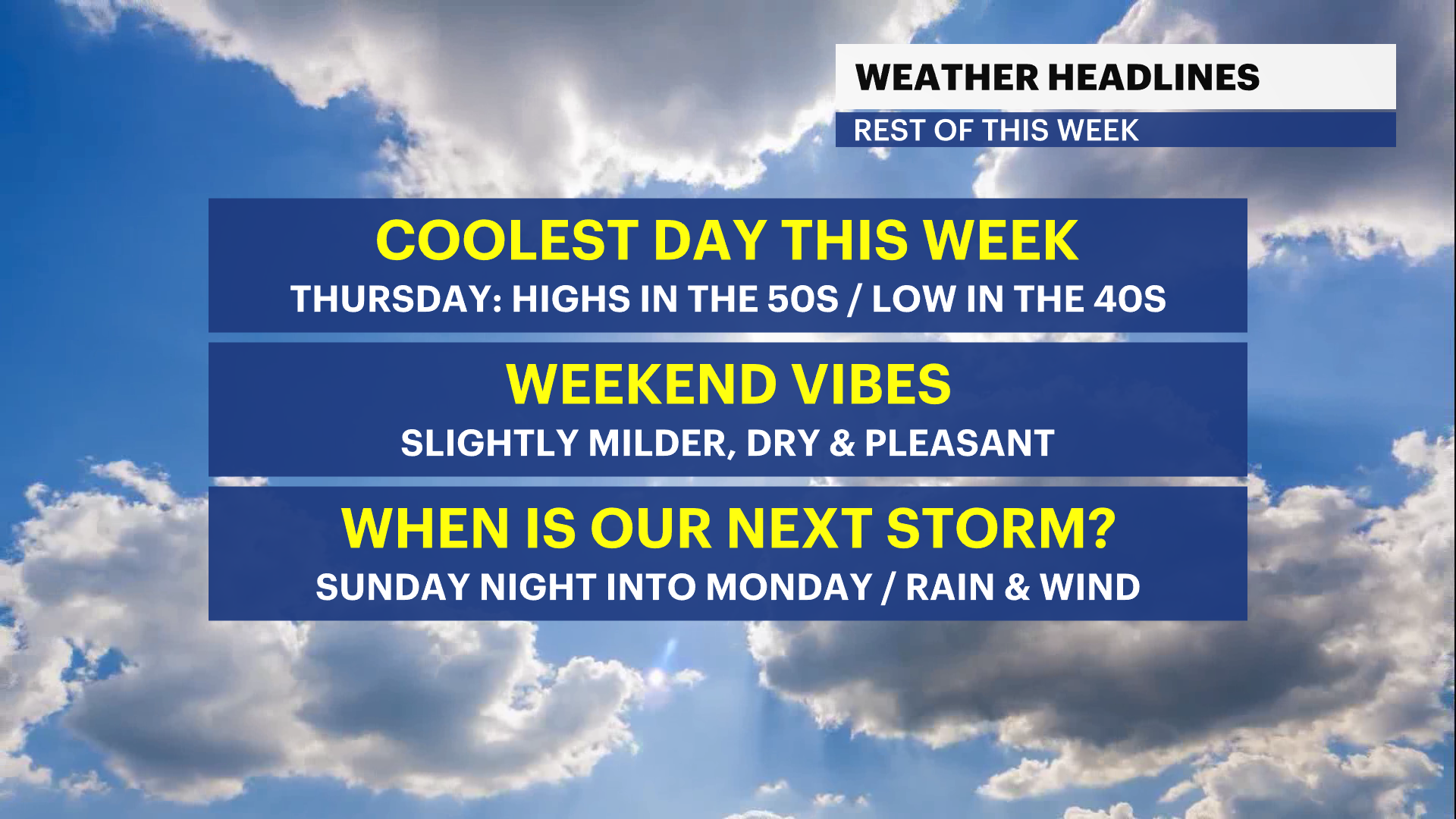 • Thursday will be the coolest day this week. It will be sunny and windy with gusts up to 30 mph. Feel-like temperatures will be in the low 50s. Thursday night will be the coldest night so far this season with lows dipping into the low mid 40s.