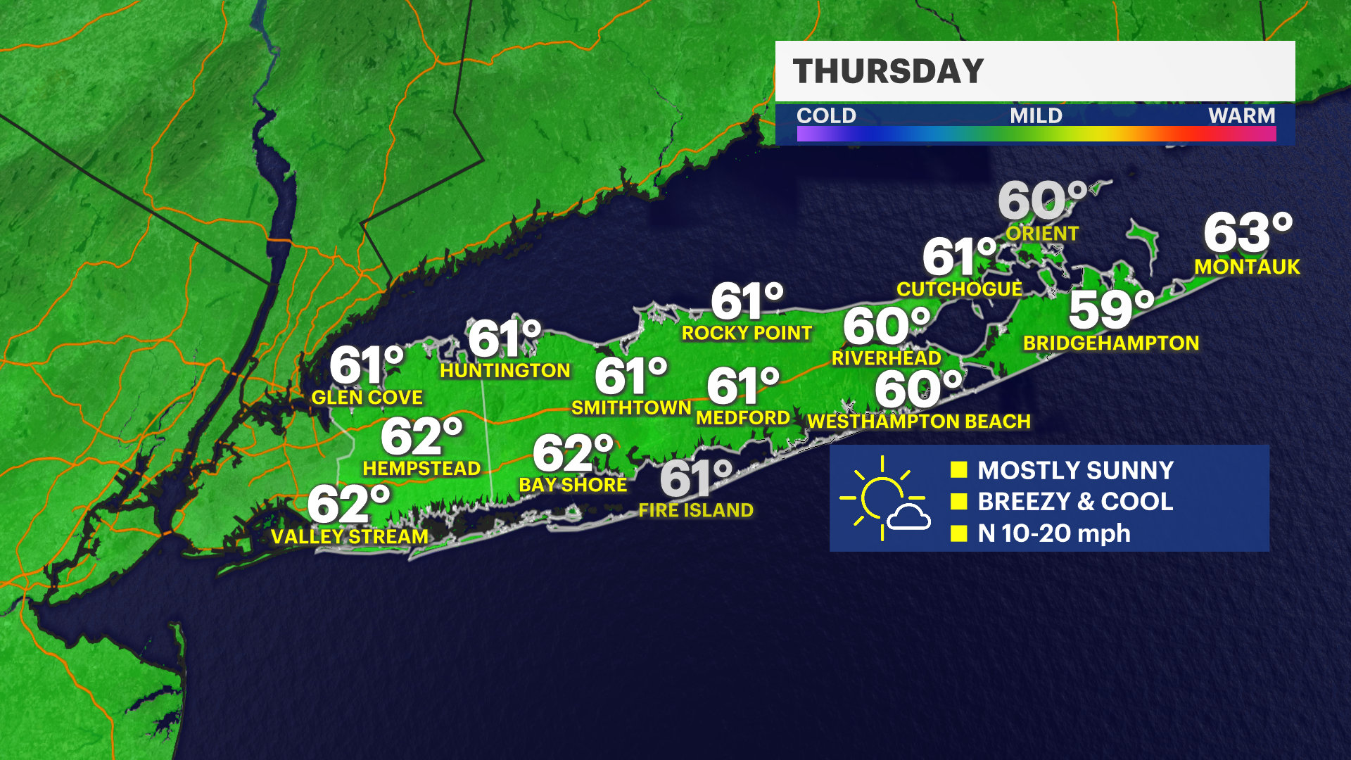 Thursday: Mostly sunny, breezy and cool with a high near 63. North wind around 15 mph.