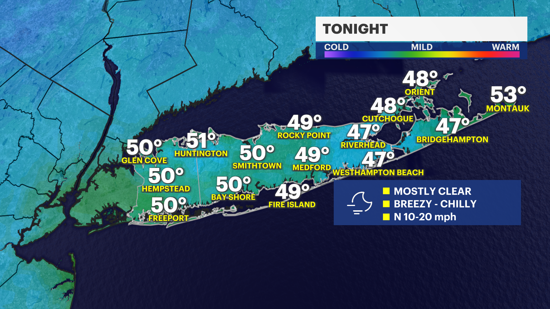 TONIGHT: Mostly clear, colder with a low around 47. North wind 10 to 15 mph.