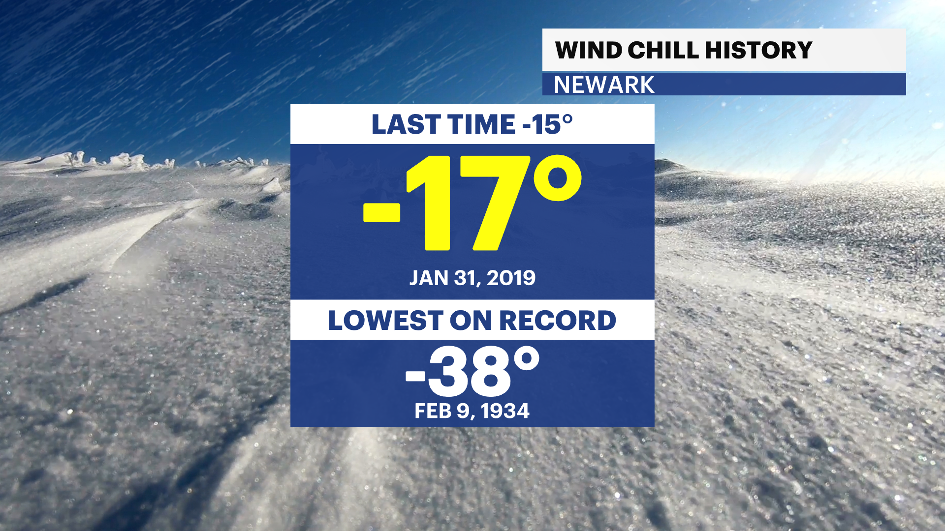 Wind chills will be abrasively cold by the midday and evening with them being as low as -15 degrees across most of NJ. Northwestern areas can have feel like temperatures as low as -20 degrees. This is a dangerous cold and it is best to stay inside and warm. The last time Newark experienced -15 degrees feel like temperatures was on January 31, 2019.