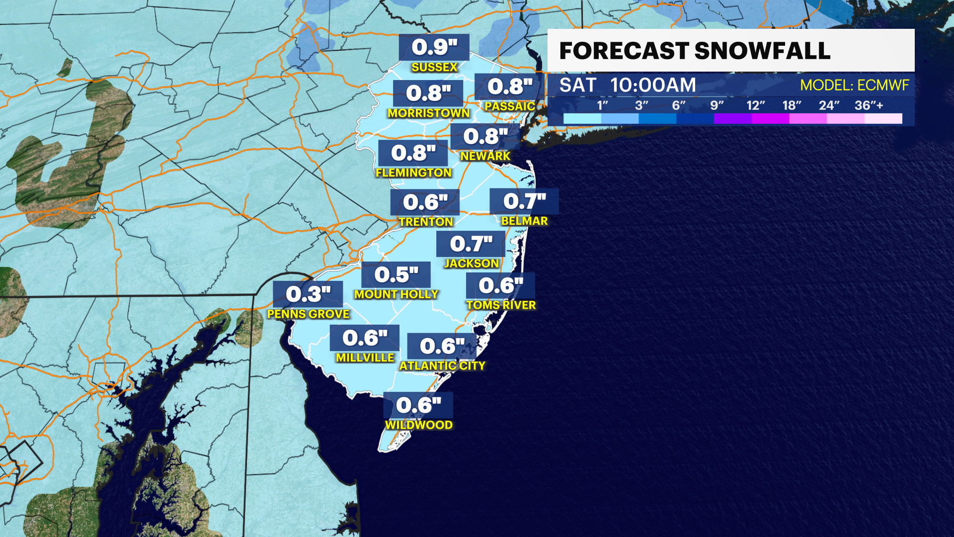 An arctic front carries an Alberta Clipper through New Jersey tonight delivering on and off light snow showers that accumulate up to 1 inch in most spots. A few locations north and west can see close to 2 inches since the snow will be fluffy. The air is dry, so most of the snow is very light. This moves through quickly after 6PM tonight and ends in the morning tomorrow.