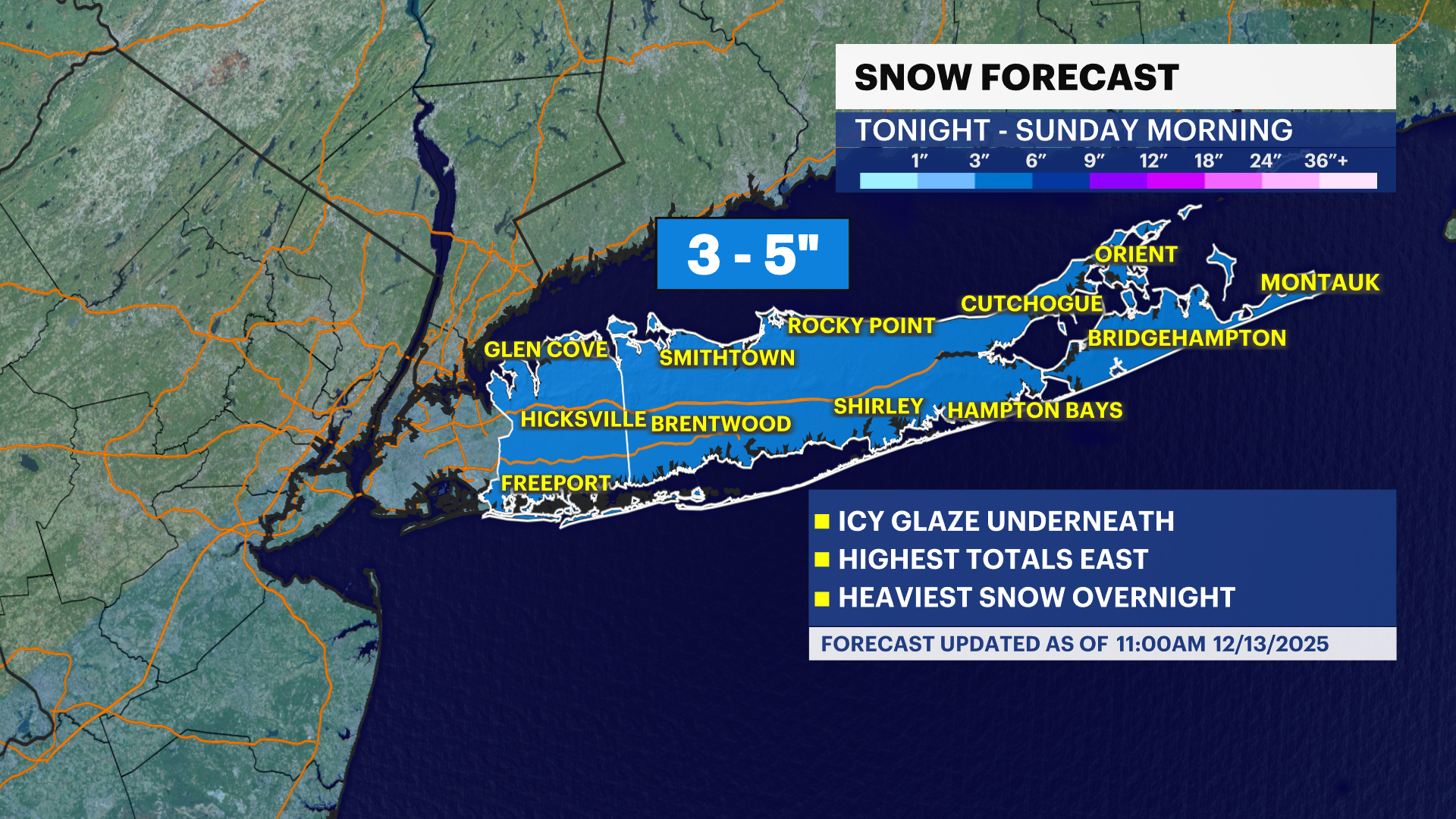 3 to 5 inches of snow is expected across the island. 4 inch+ totals are likely over Suffolk county with totals closer to the 3 inch range in Nassau county. A few snow totals will be under this range in Nassau county and it is possible to see a few totals over this range in Suffolk county.