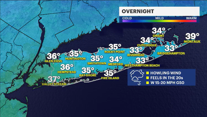 OVERNIGHT: Partly cloudy, windy, and very cold. Wind gusts range from 30 to 50 mph and feel-like temps in the 20s. Lows in the 30s.