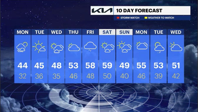 WEDNESDAY: Sun and clouds, near seasonable temperatures. Highs in the upper 40s. Lows in the mid-30s.