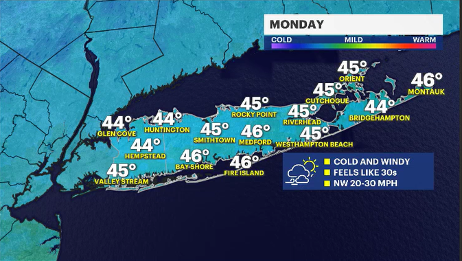 MONDAY: Dress for the cold and wind. Sun and clouds, windy and very cold in the morning. Gusts will still range from 30 to 40 mph in the afternoon. Highs will be in the mid-40s, lows in the 30s.