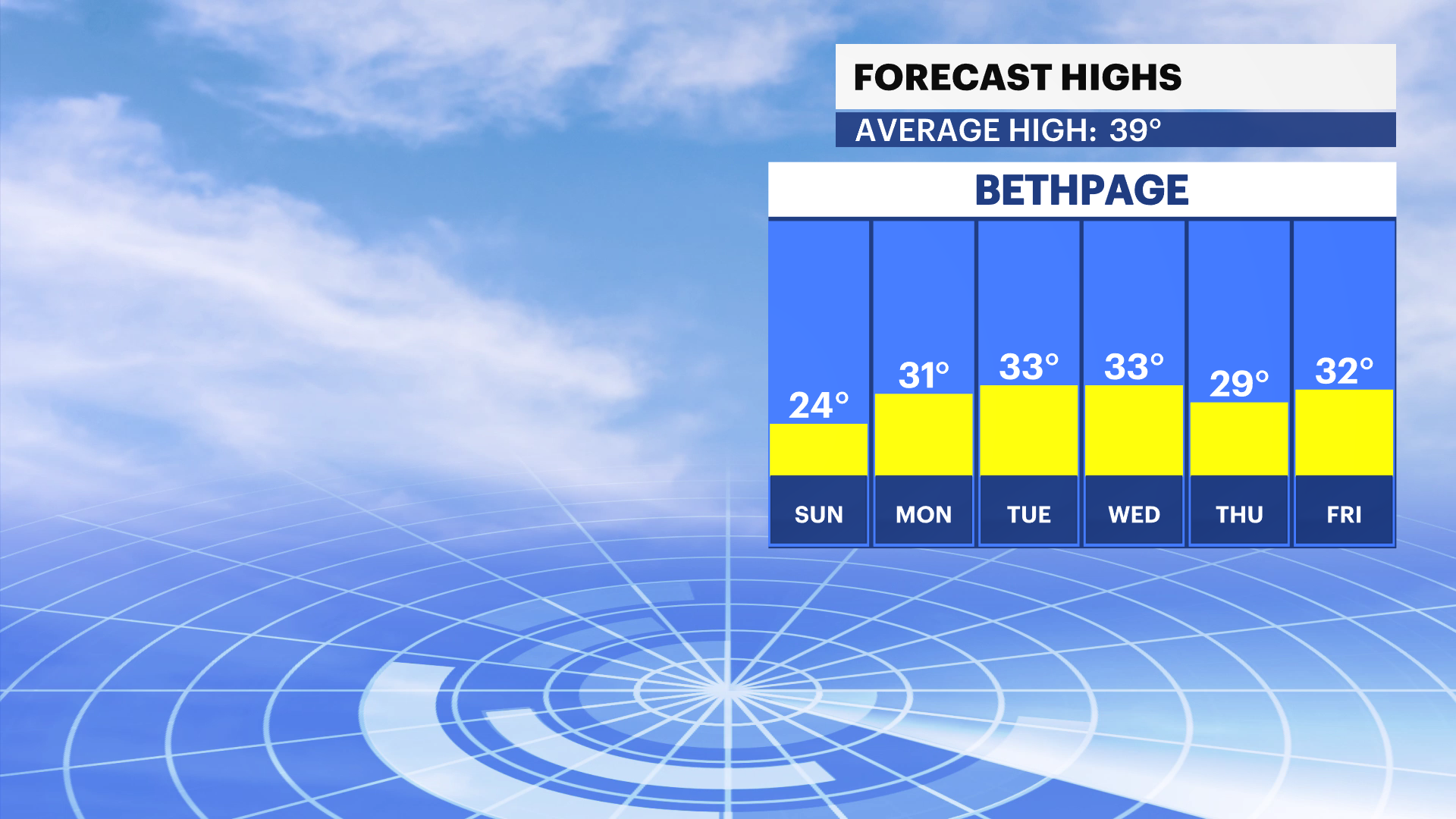 Expect the streak of temperatures below freezing (32 degrees) to come to an end on Tuesday, and possibly could even do so on Monday as the daytime high flirts with 32 degrees by the afternoon. Winds will be lighter Tuesday and Wednesday with highs below-seasonable, still, temperatures will be a degree or two just above freezing. Aside from the cold, the week is pretty quiet. There is a chance for a clipper system to bring light snow overnight Tuesday into early Wednesday morning, which could bring a dusting for some, but as of now, we are not expecting notable snow accumulations.
