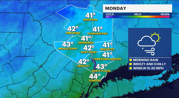 The rest of Monday is cloudy and breezy with rain tapering off in the afternoon and some peeks of sun in the evening. Highs are only in the mid to low 40s on Monday.