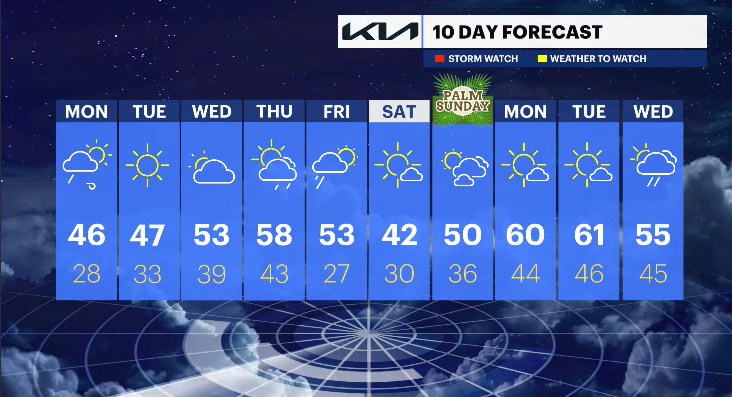 The next chance for rain arrives Thursday evening into Friday. The middle and end of the work week is pleasant otherwise, with highs in the 50s.