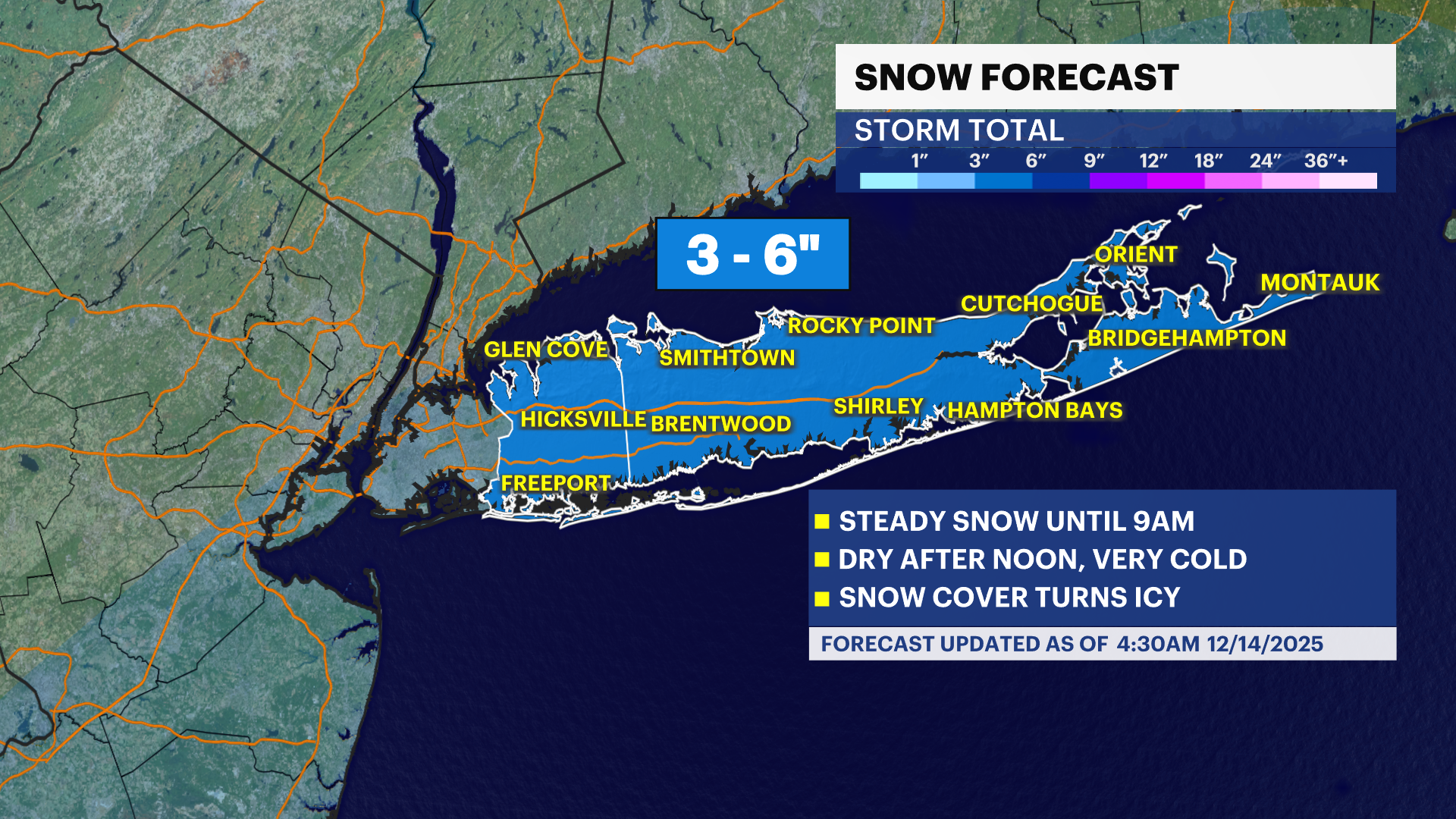 Steady, accumulating snow is expected until 8 a.m. for Nassau County and until noon for parts Suffolk County. Our forecast is on target for a general 3 to 6 inches across the island, but a few neighborhoods could be outside of this range.