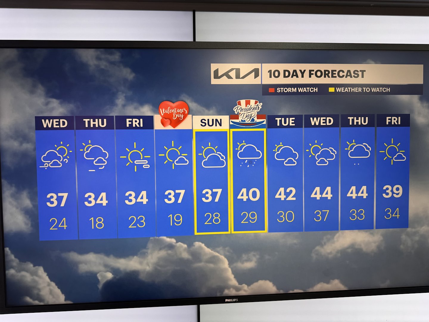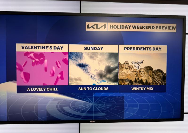 The Presidents Day holiday weekend lies ahead of us and so is the potential for a winter storm. Thankfully, that trend has been to keep the system just to our south, but we are still keeping an eye on it. Sunday into Presidents Day is when a round of mixed wintry showers will be possible. Valentine's Day is on Saturday, and it will be a dry one with a lovely chill in the air.