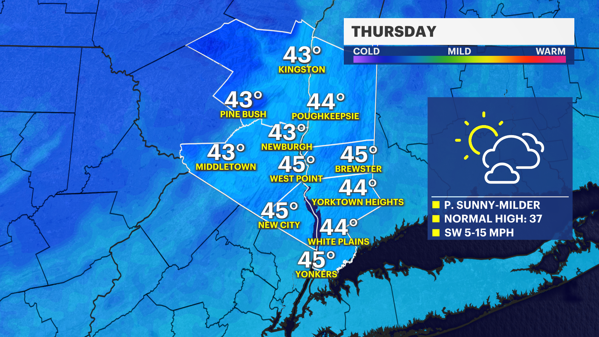 Before that, Thursday will be the mildest day of the week, and for the rest of January. Temperatures will climb above the normal high of 37 degrees for many across the Hudson Valley. There will be a mix of sun and clouds along with a southwesterly flow of winds.