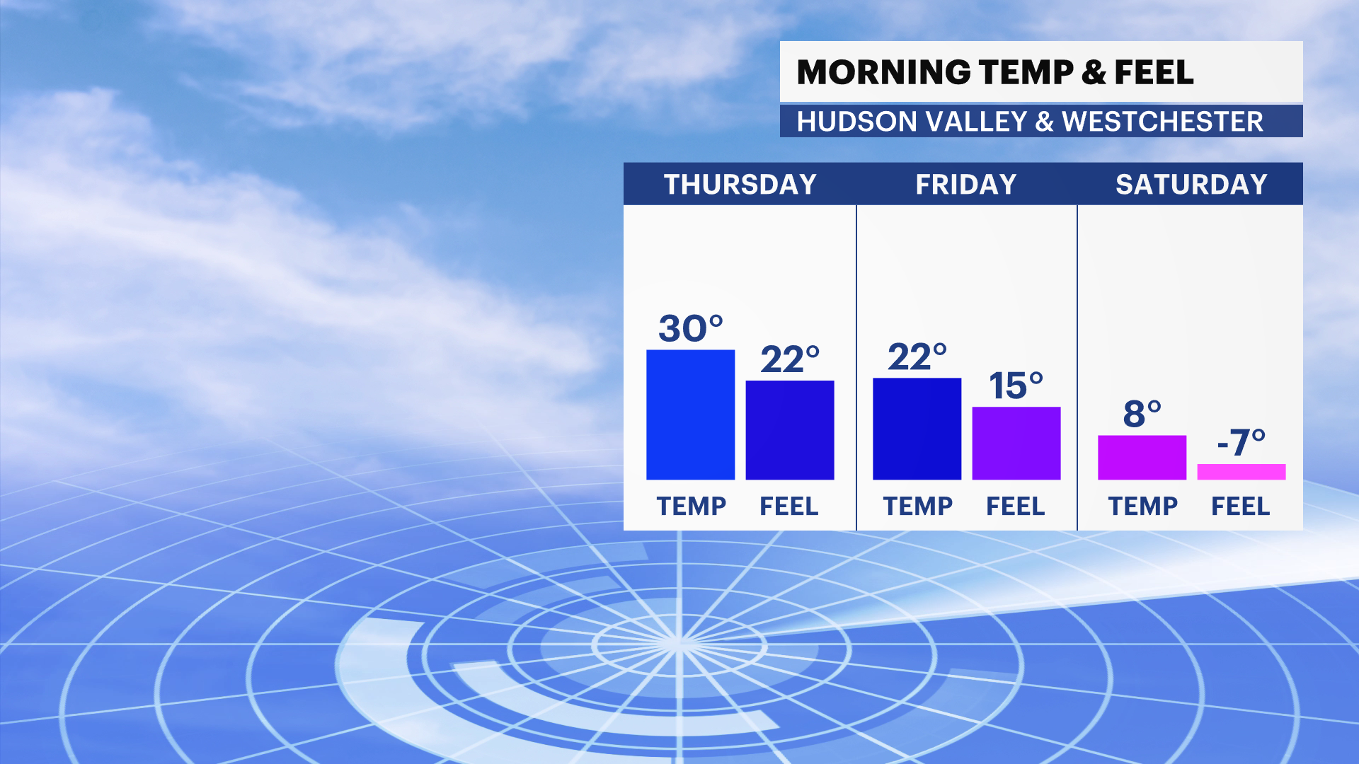 FRIDAY: Partly cloudy and breezy at times. Highs: Upper 20s to low 30s. Lows: Mid- to upper single digits.