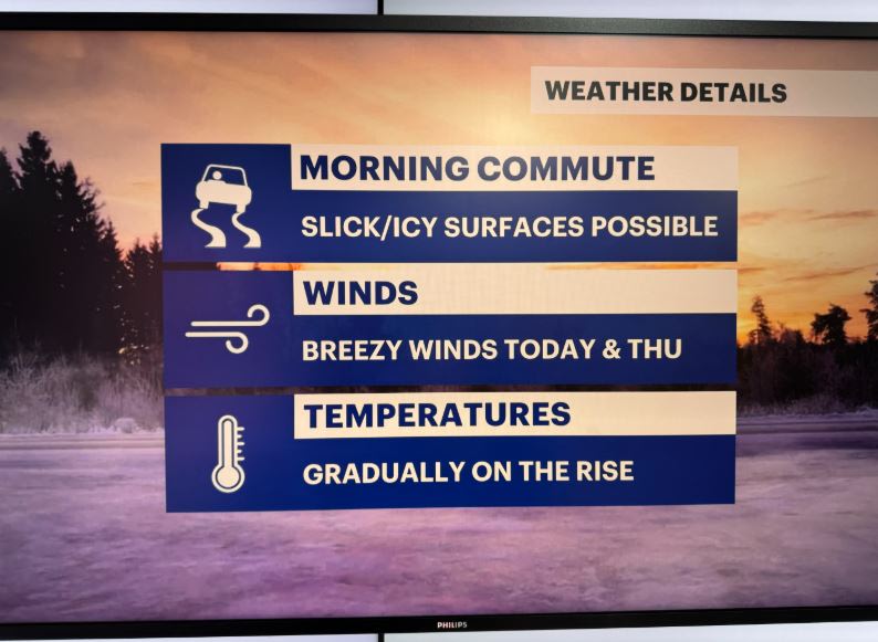 TODAY: After an icy start to the day, the temps move up as the winds pick up. Expect a mix of sun and clouds. Highs: upper 30s to low 40s.