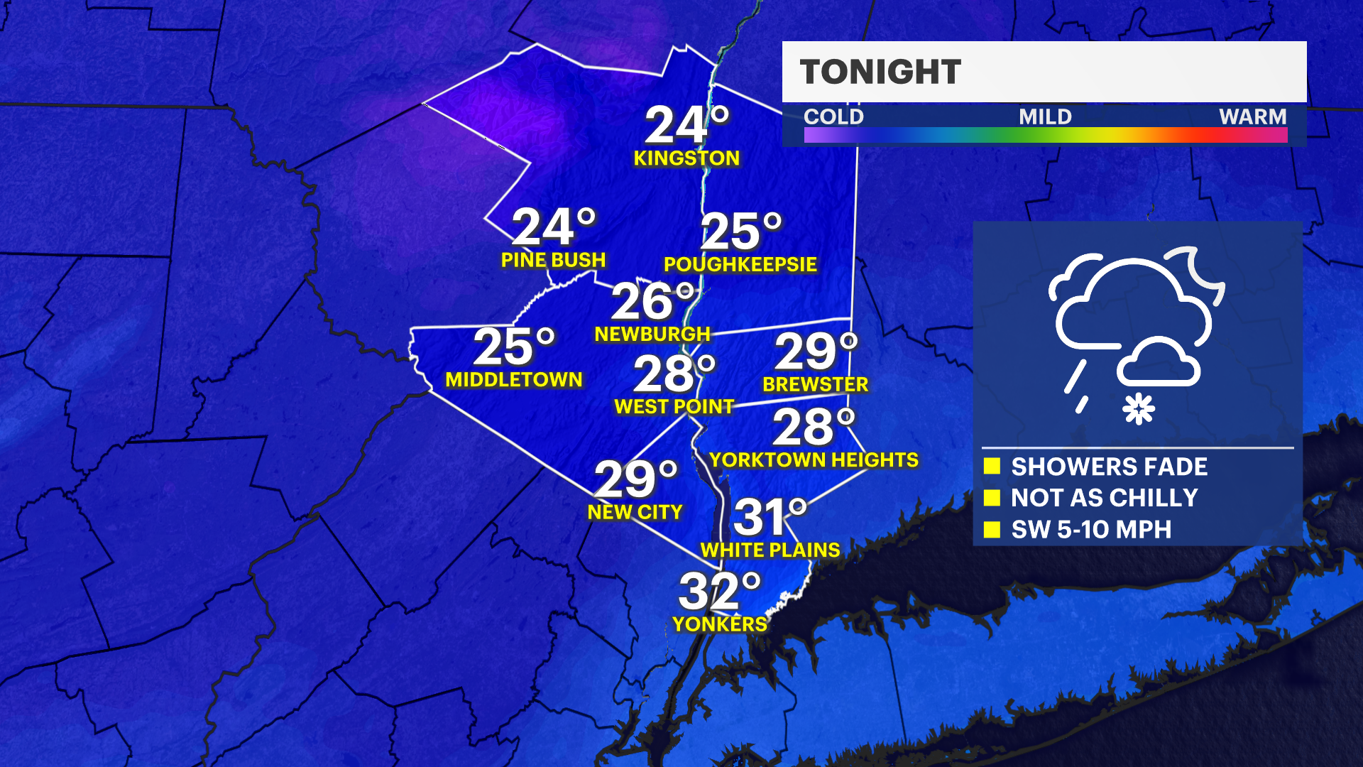 TONIGHT: Mixed showers fade to mostly cloudy skies and temps not too cold. Lows: Mid-20s to low 30s.