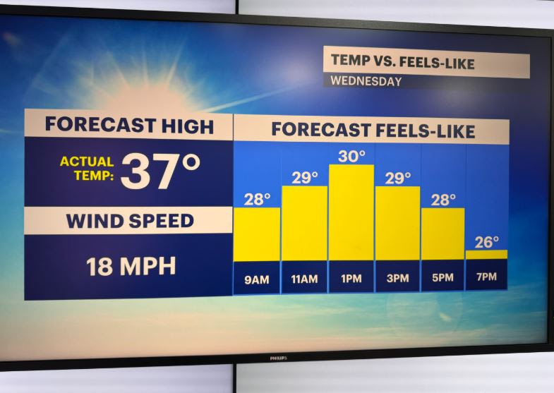 THURSDAY: Partly cloudy and breezy through much of the day. Highs: Mid-30s. Lows: Upper teens.