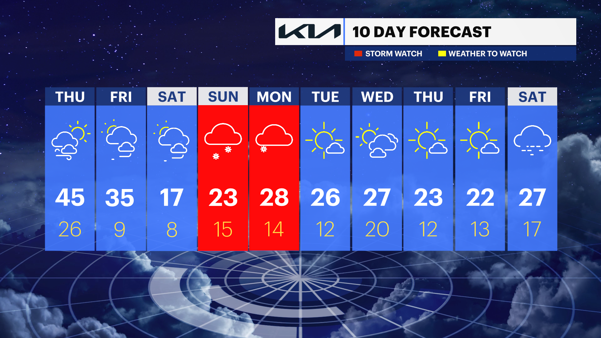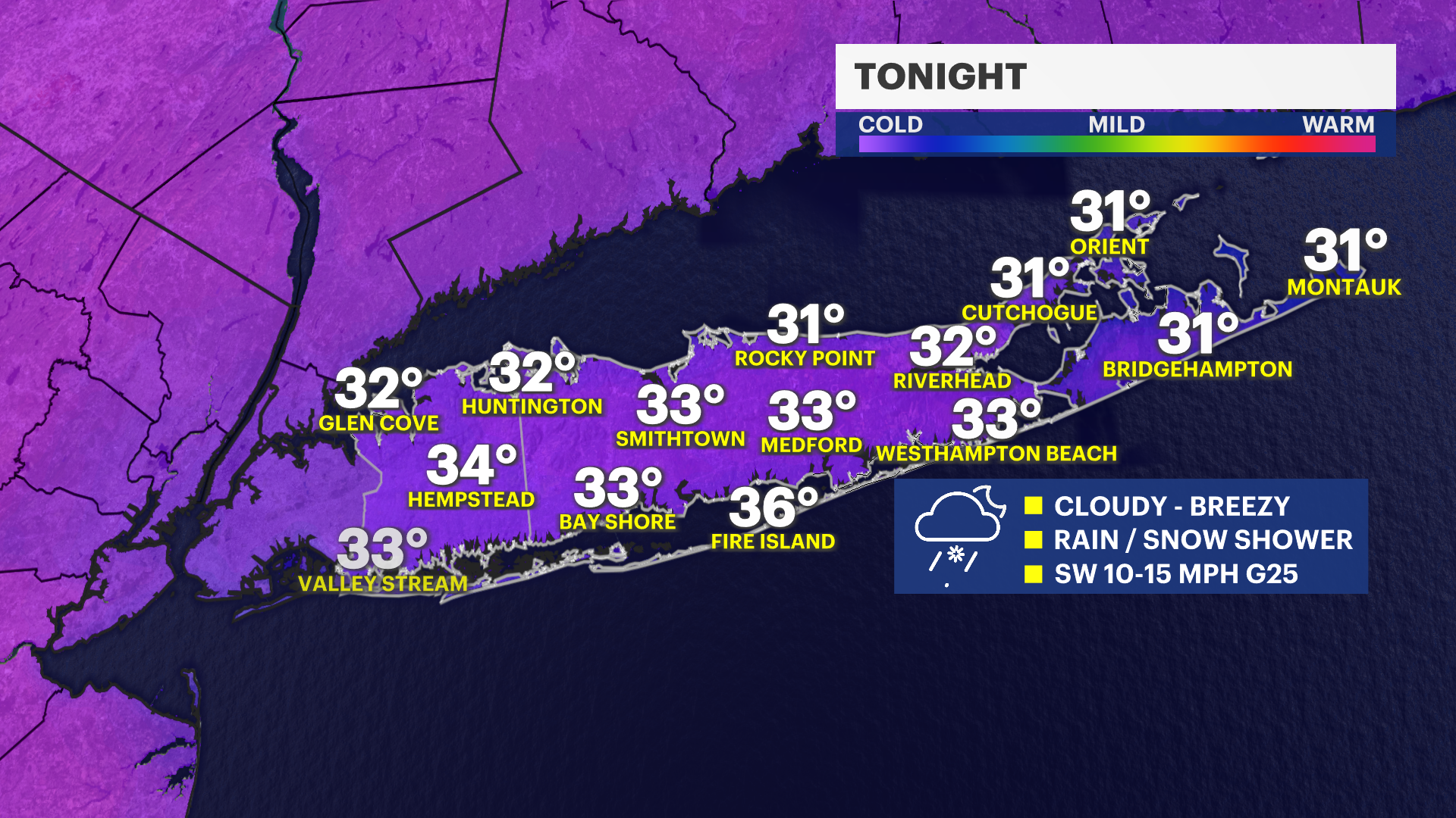 LI WEATHER LEADING UP TO THE STORM: Tonight, expect a couple of passing mixed snow and rain showers with temperatures rising through the night into the upper 30s. It will be breezy, too. Thursday will be the most comfortable day to plan and prepare for this weekend's storm chance. High temperatures will be in the 40s on Thursday with a mix of sun and clouds. A gusty breeze will still make it feel like the 30s, but it will feel better than the start of this week! Friday and Saturday will be dry, too, but another shot of Arctic air returns Friday evening and lasts into next week.