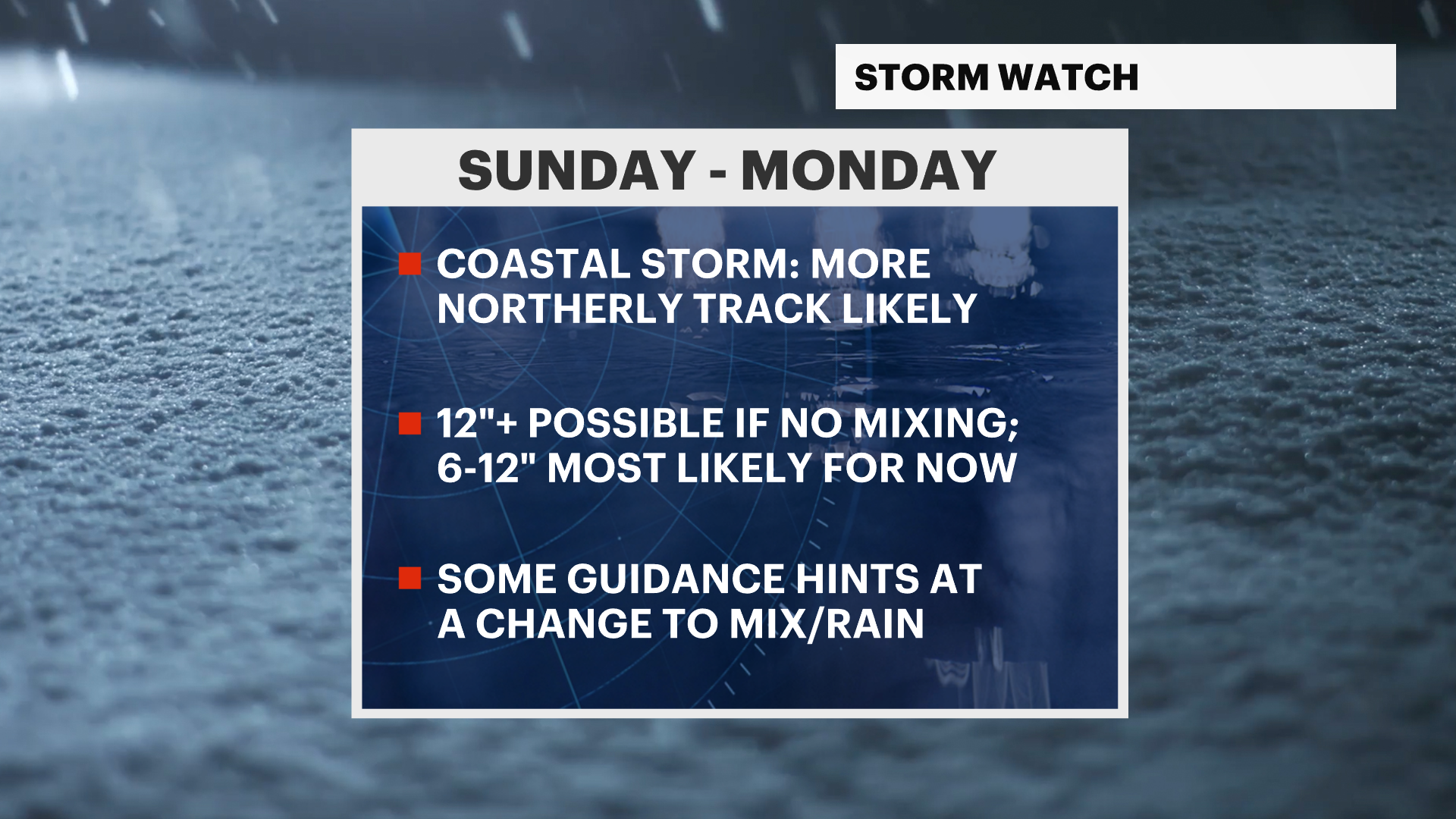 The News 12 Storm Watch Team is continuing to track the chance for a significant winter storm Sunday into Monday.