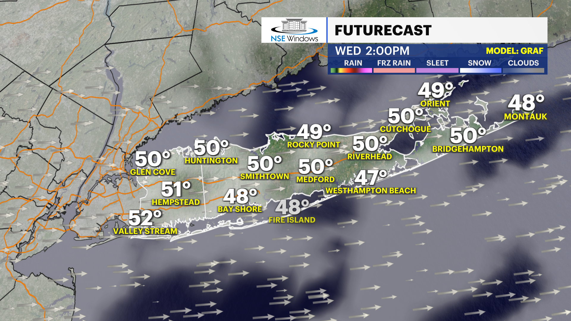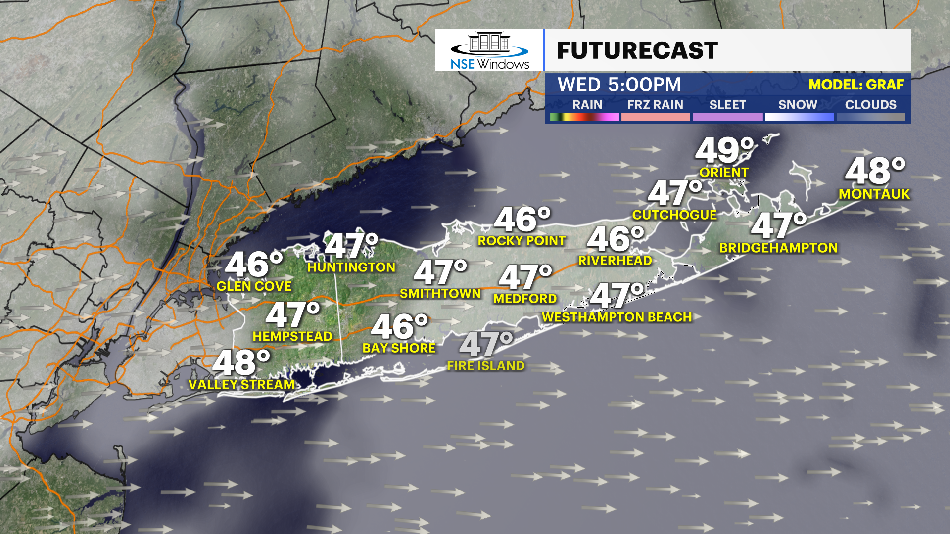 Saturday: Mostly sunny with late day clouds with a high near 52.