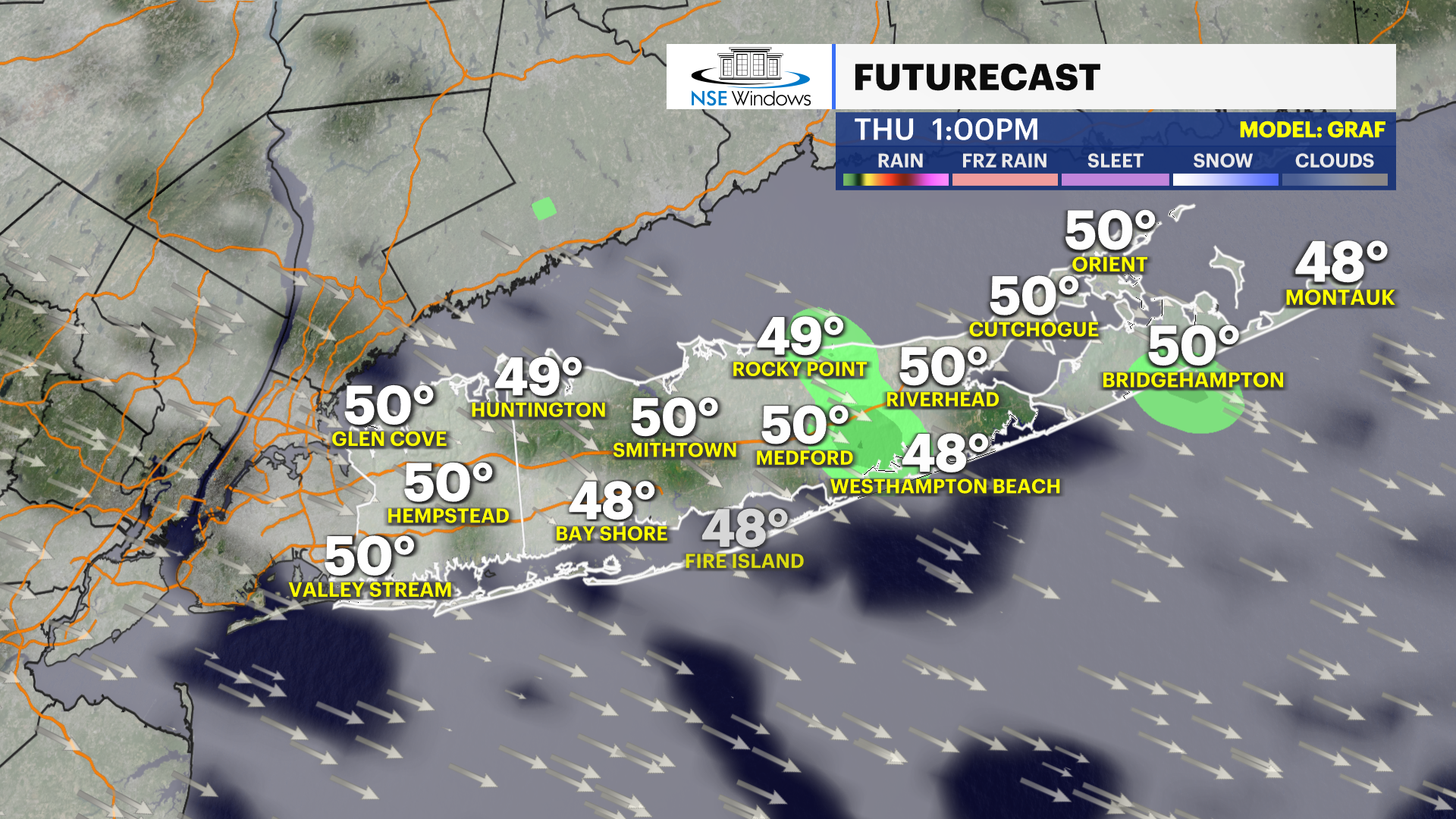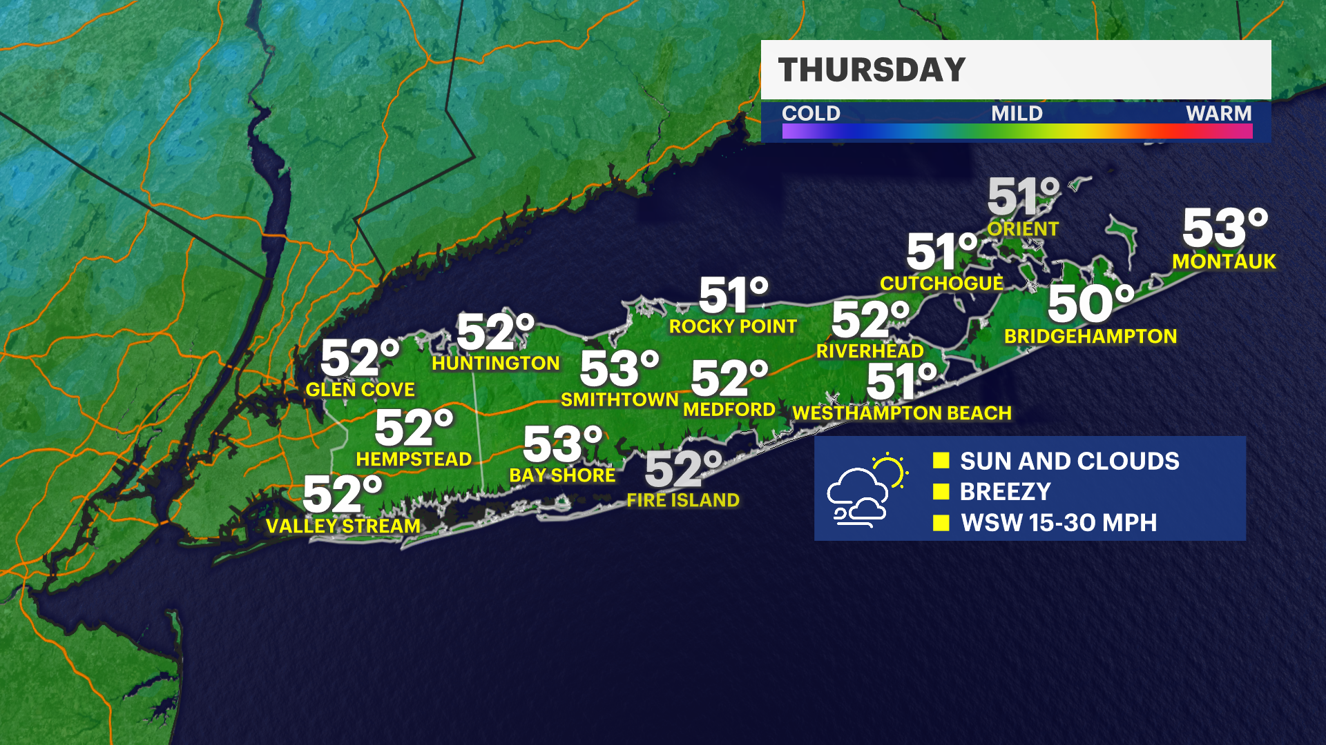 Thursday: Sun and clouds, chance of passing afternoon shower. High near 52. Breezy. West wind 15 to 30 mph.