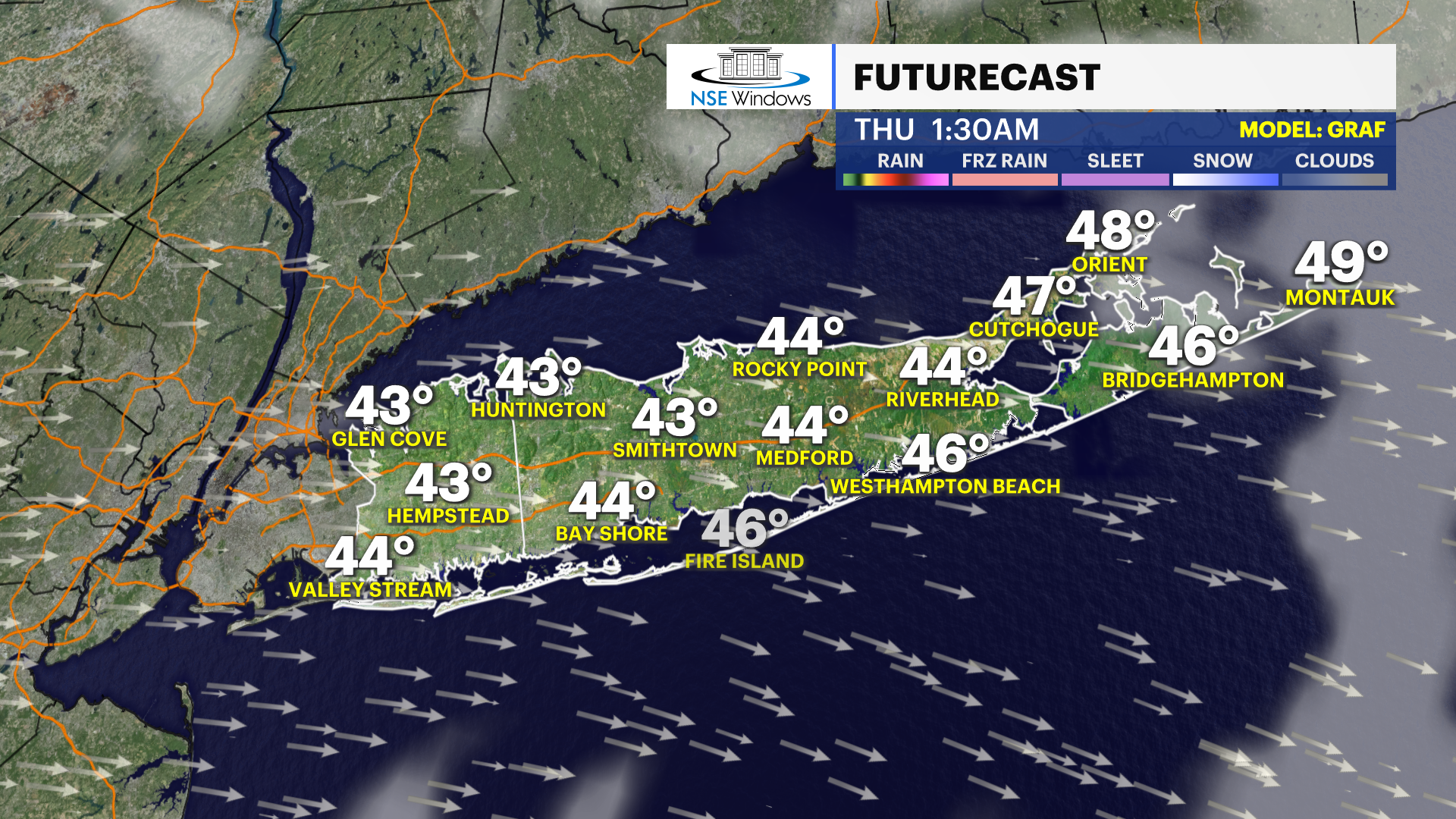 Saturday Night: Scattered showers developing. Cloudy skies with a low around 41.