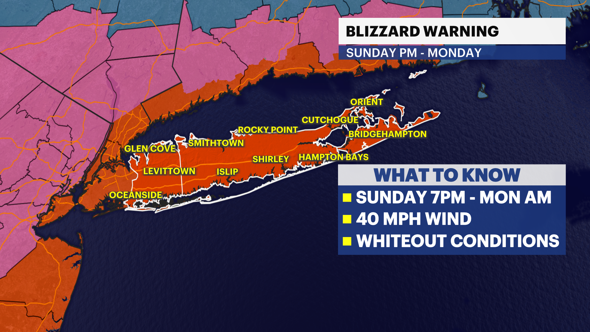 The National Weather Service has issued a Blizzard warning for Long Island. Whiteout conditions are expected Sunday night through Monday morning.