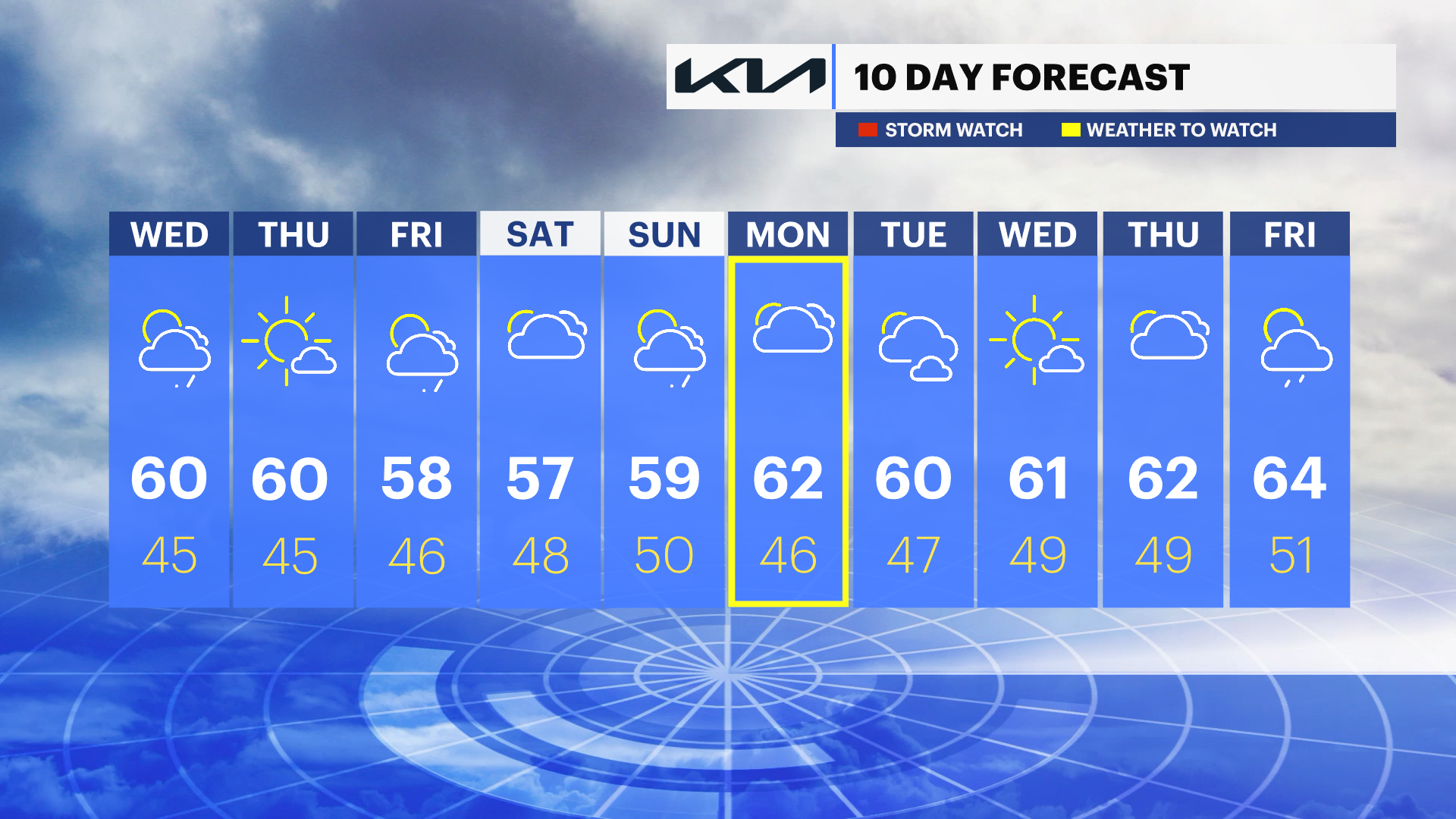 NEXT: The first round of showers will arrive late Friday. Still questions on rainfall for Saturday whether or not a storm will pull away from us. Right now it looks mostly cloudy with the chance for a few showers, mostly early in the day. Another round of rain arrives Sunday evening into Monday. It will be breezy with moderate to heavy rainfall. No major impacts but we highlighted the 10DAY to alert for a wet Monday morning commute.